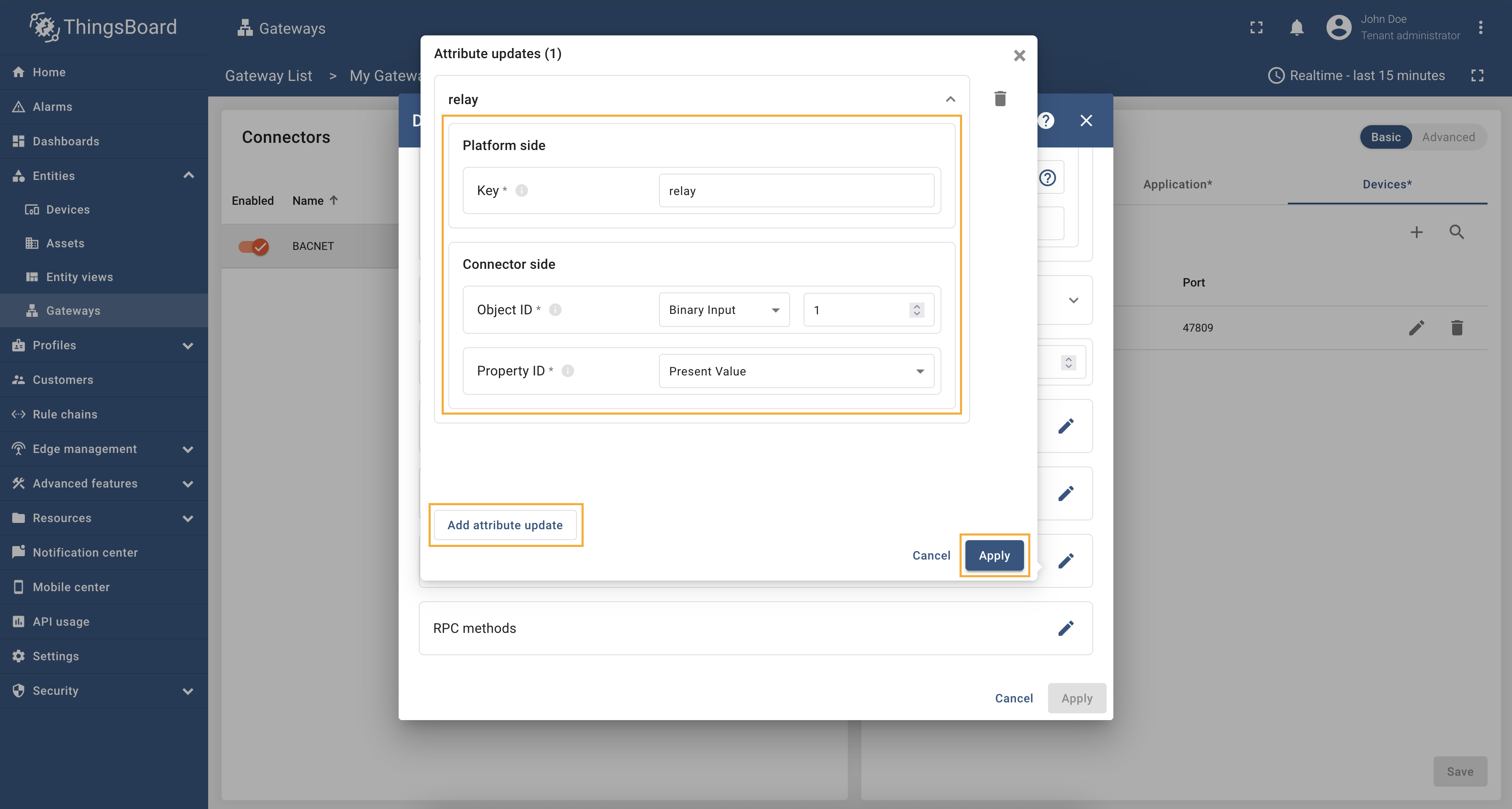 - Attribute updates - allows update device objects values from ThingsBoard platform instance.