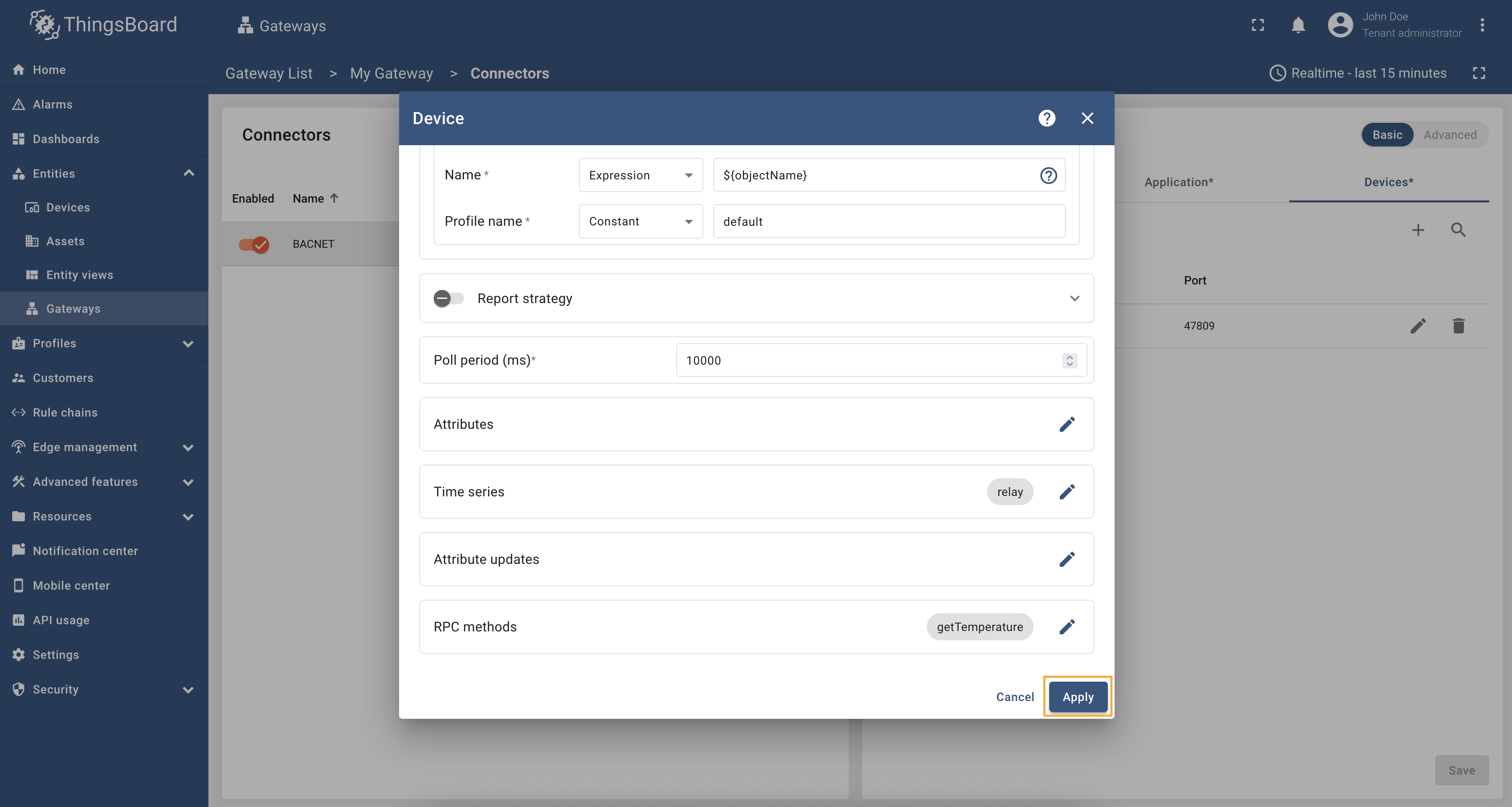 There are situations when a BACnet device has a lot of objects, and you want to read all the objects of the device without having to manually add each object to the connector configuration. Or maybe you don’t know what objects are in the device and want to read all the objects automatically. The BACnet connector supports this functionality and allows you to read all the objects of the device by easily configuring just one parameter. Let’s look at an example of how to properly configure reading all device objects. In order to read all the device objects, you need to decide where exactly the values of these objects will be stored: