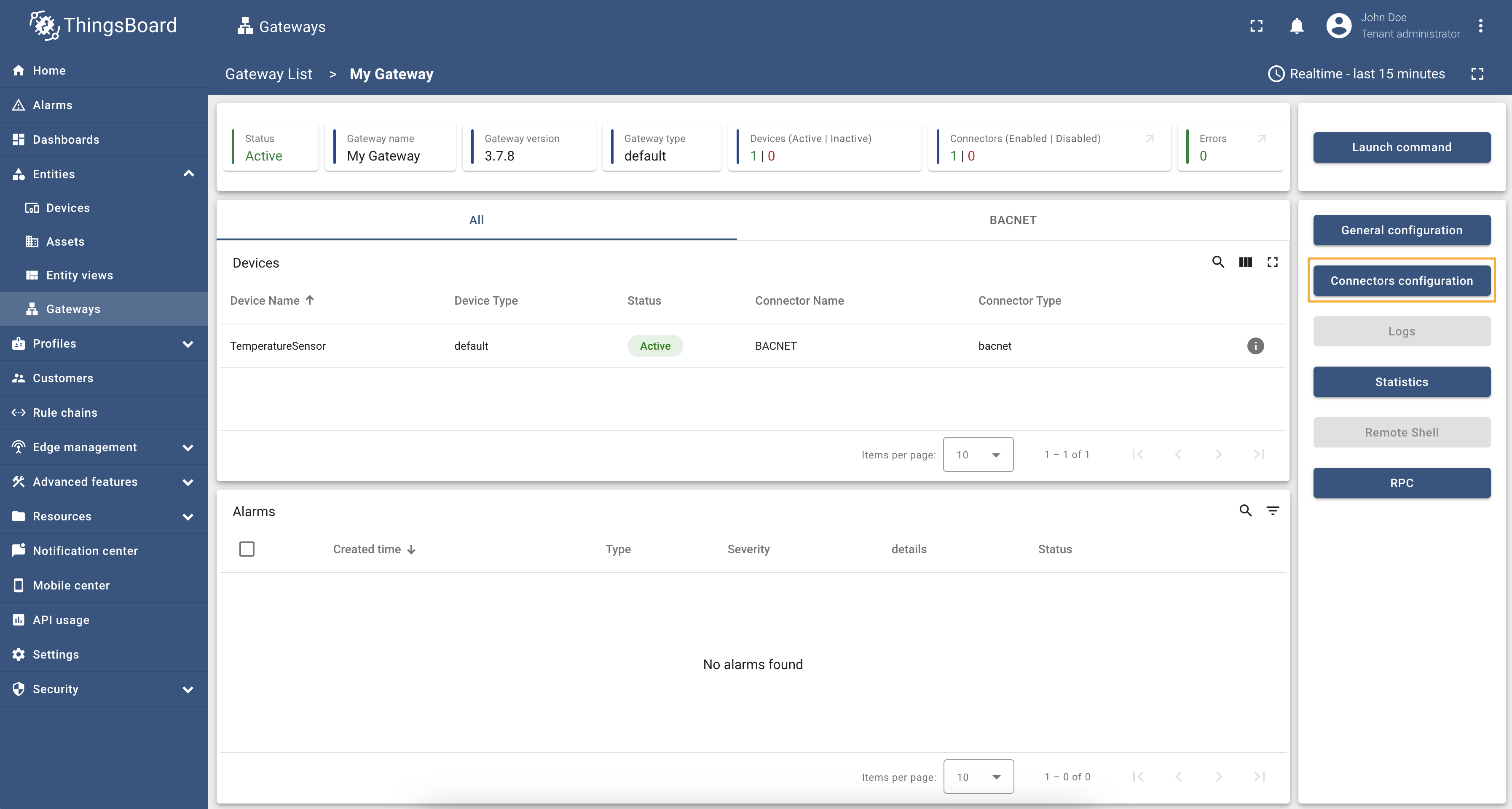 The BACnet connector allows the ThingsBoard IoT Gateway to communicate with BACnet devices, enabling data exchange and control capabilities. The connector can be configured via the user interface form, which helps you set up a connection to the BACnet devices, collect data and write data to devices. Let’s look at all the available settings and explain each one clearly. This will help you understand how everything works.