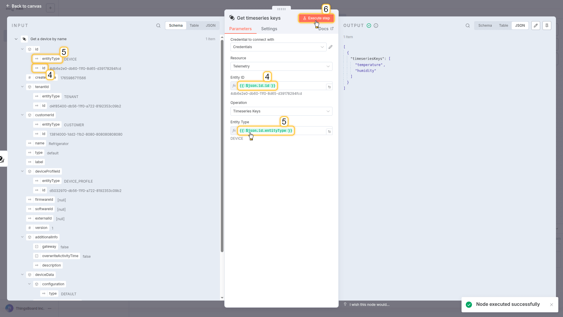 This step retrieves the device entity from ThingsBoard using the name provided by the trigger.
