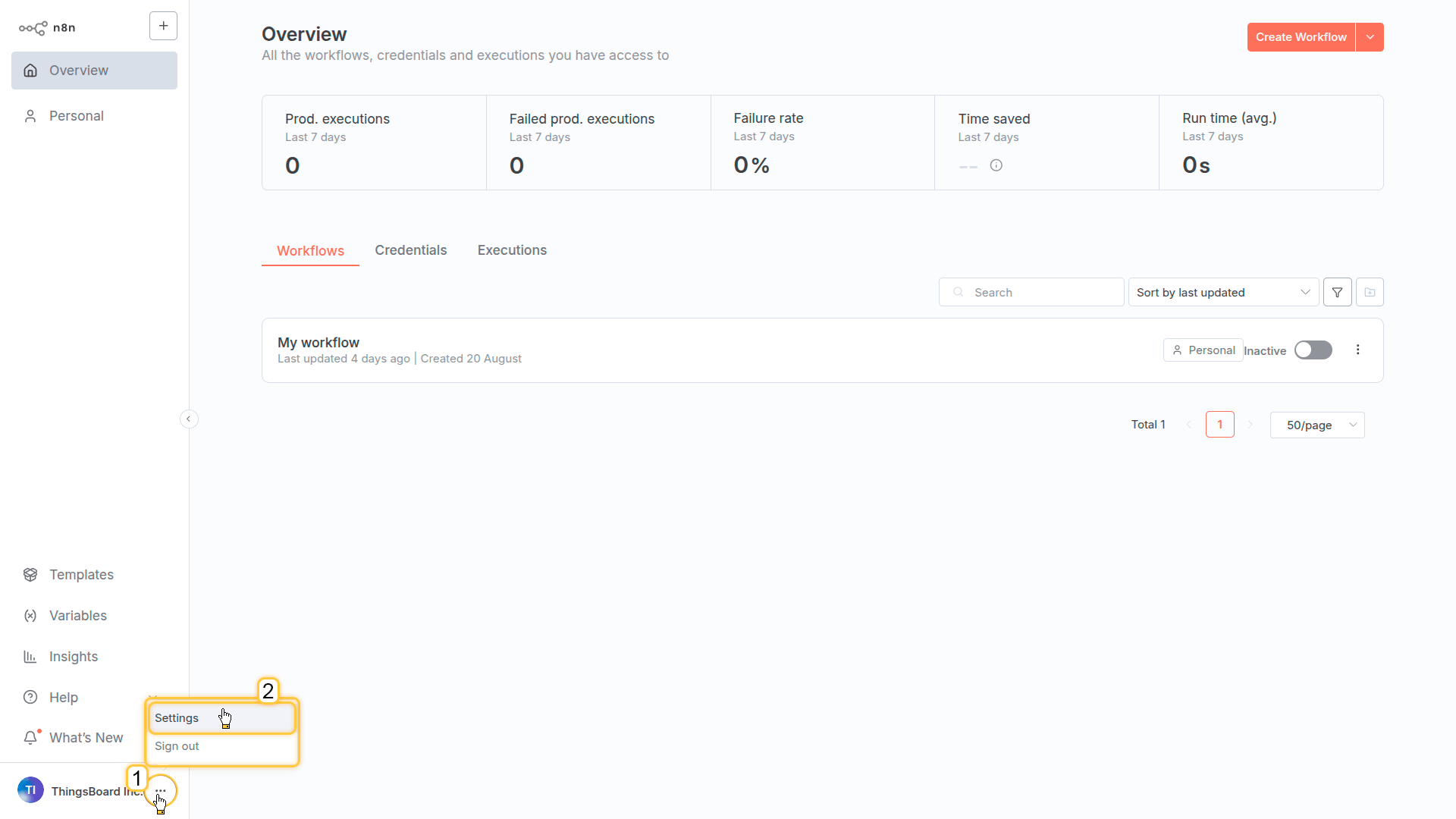 Open n8n in your browser. In the bottom-left corner, click the three dots button and select Settings from the dropdown menu.