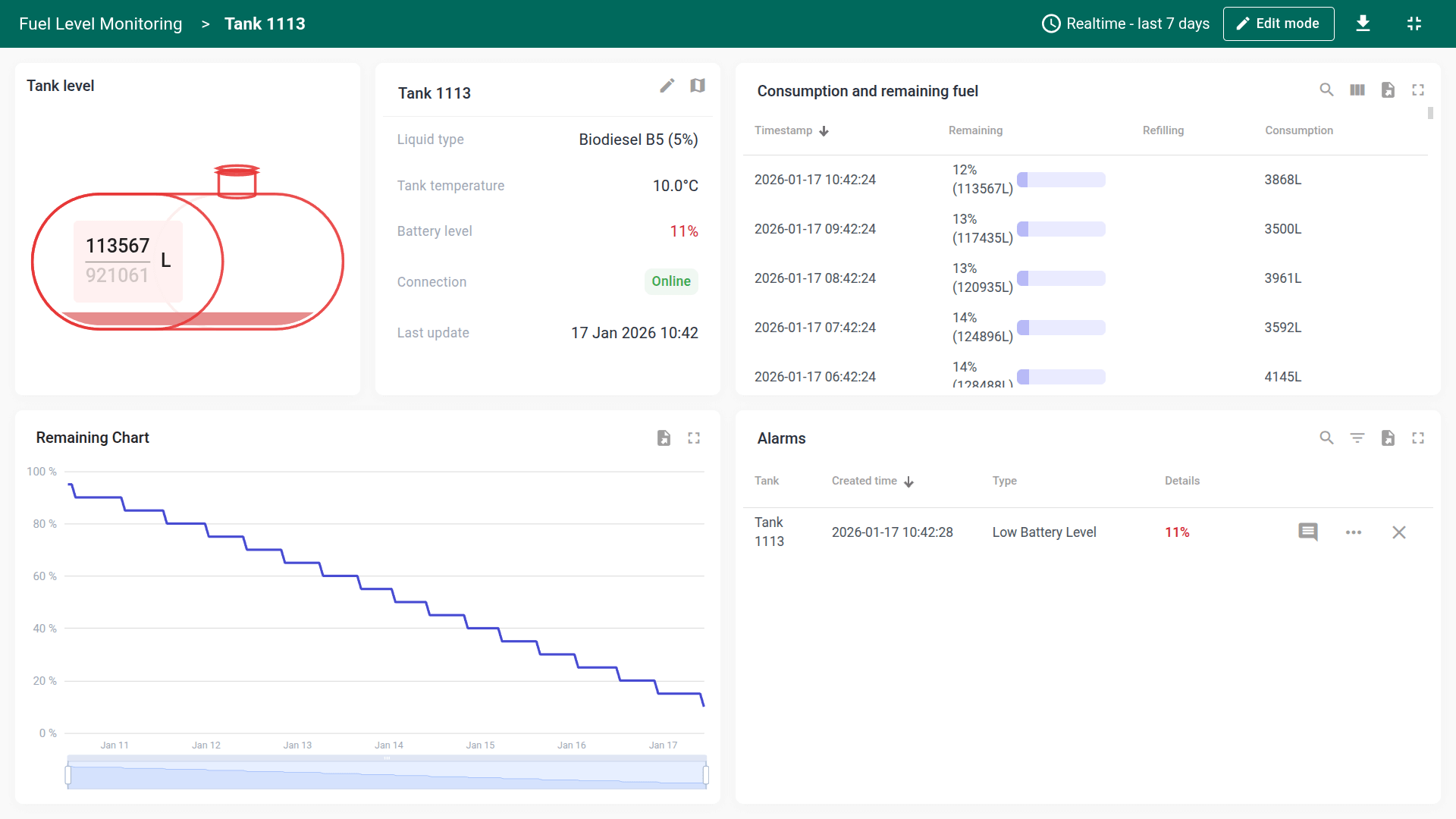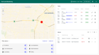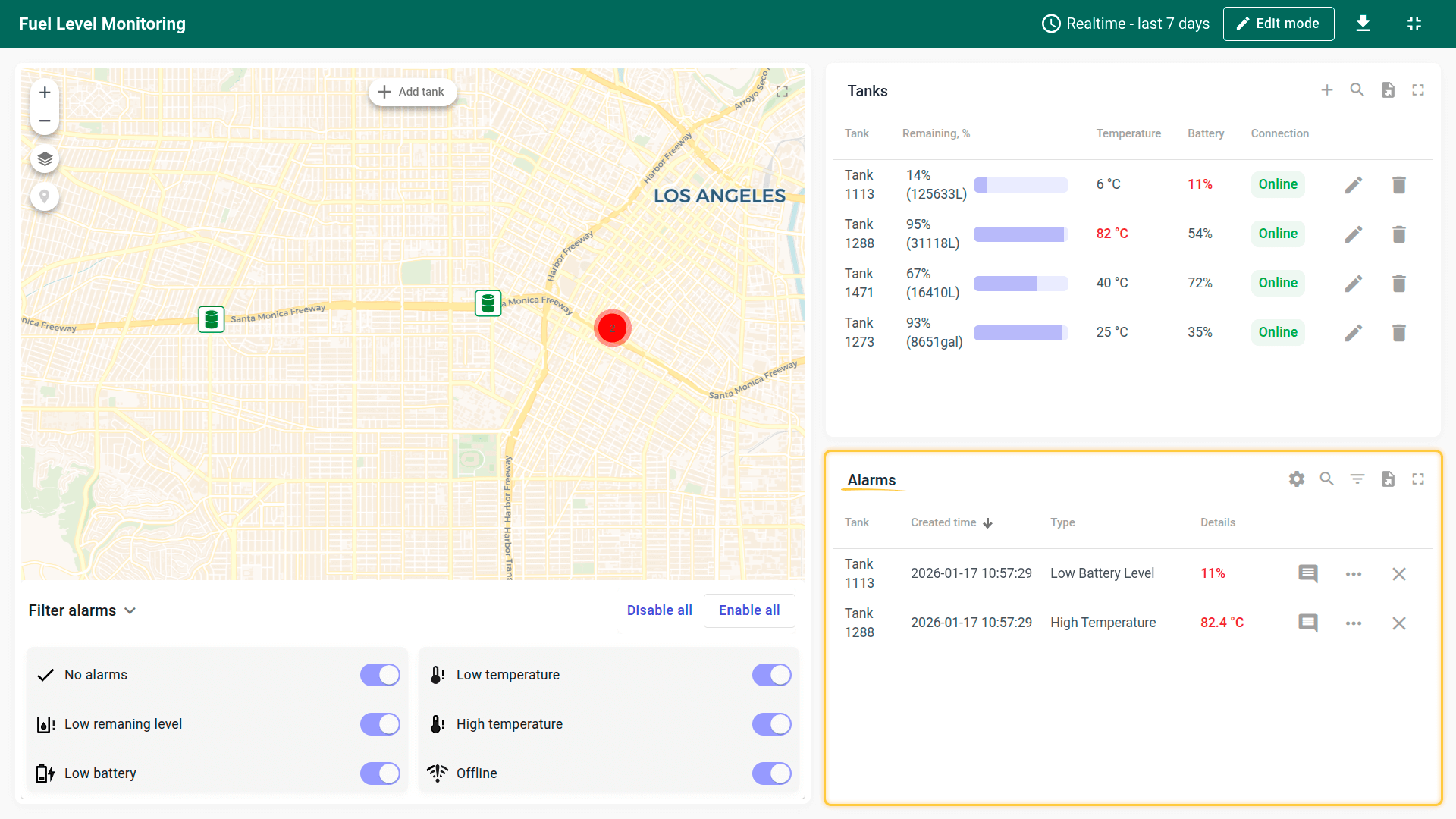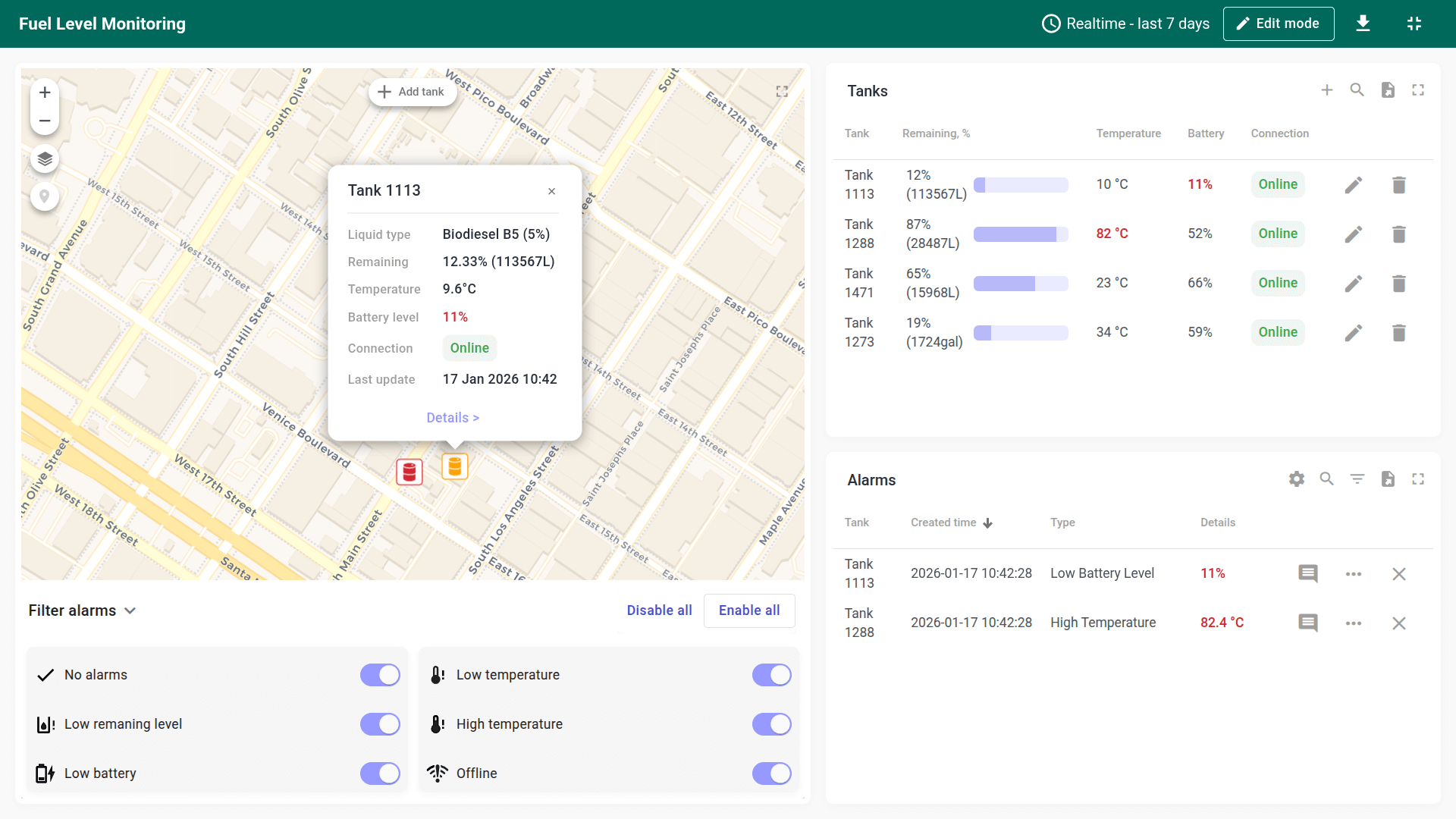 - Dashboard. The Fuel Level Monitoring dashboard provides an interactive map with color-coded tank status markers, centralized alarm management, tools for tank creation and configuration, and historical analytics for fuel consumption and refilling events.
