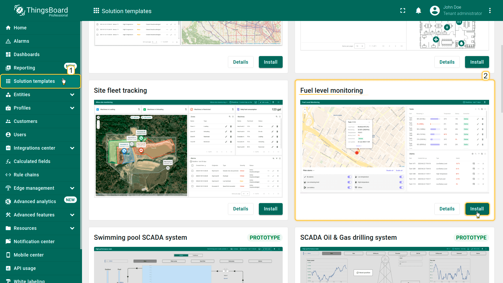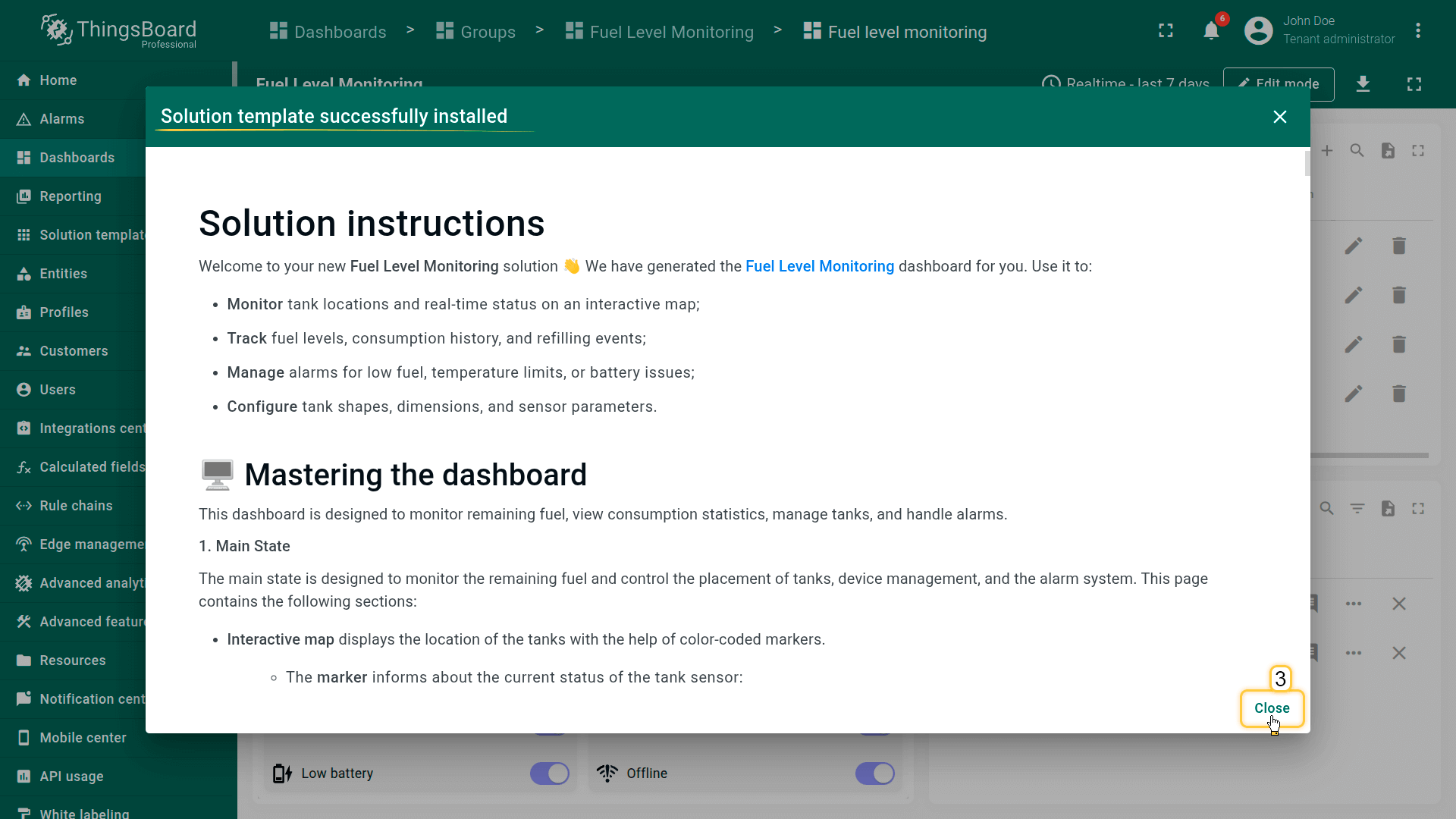 With a single installation action, the solution deploys a fully functional dashboard, device profiles, rule chains, alarms, and demo devices.