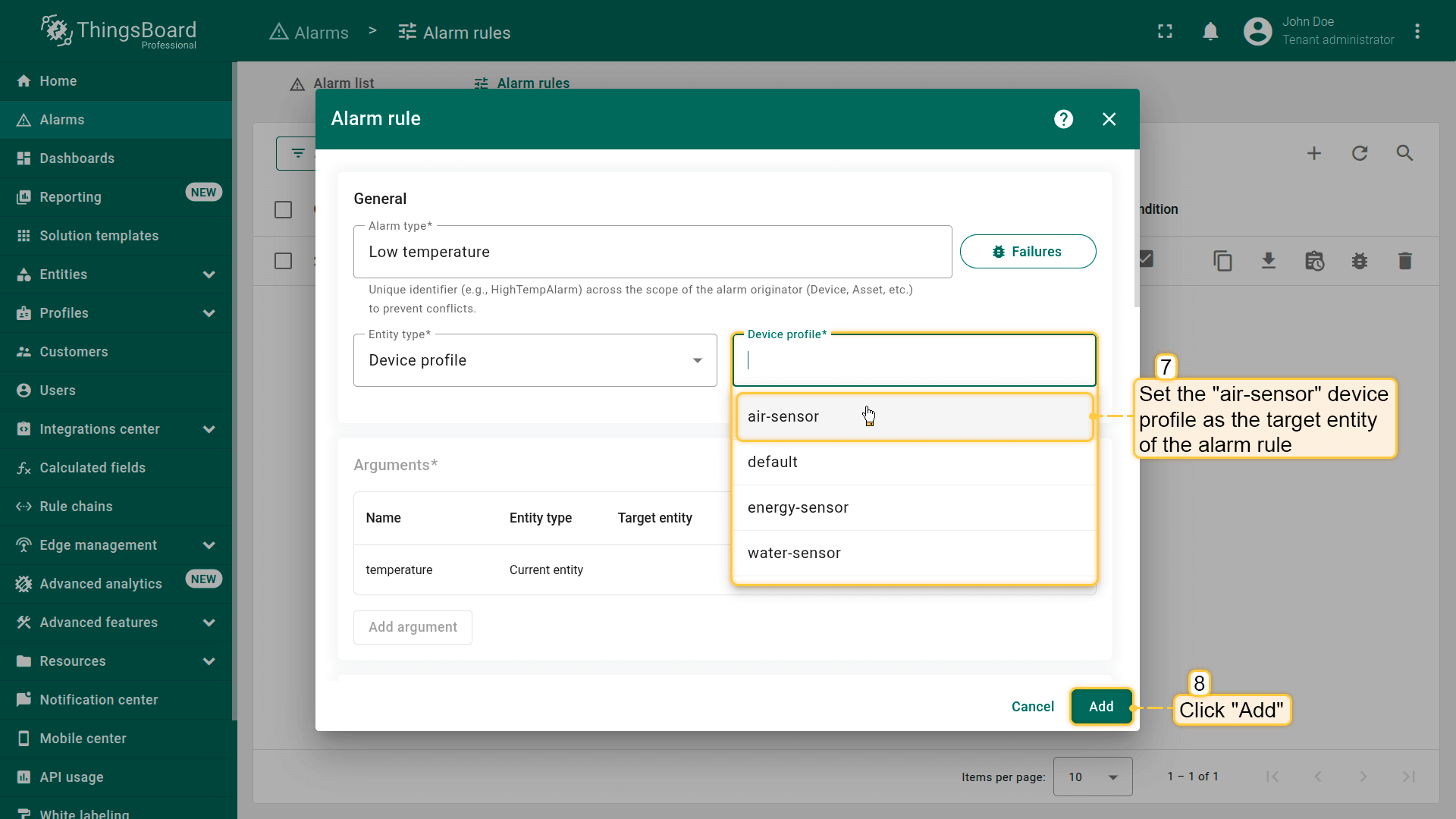 Make sure to set the “air-sensor” device profile as the target entity of the alarm rule.