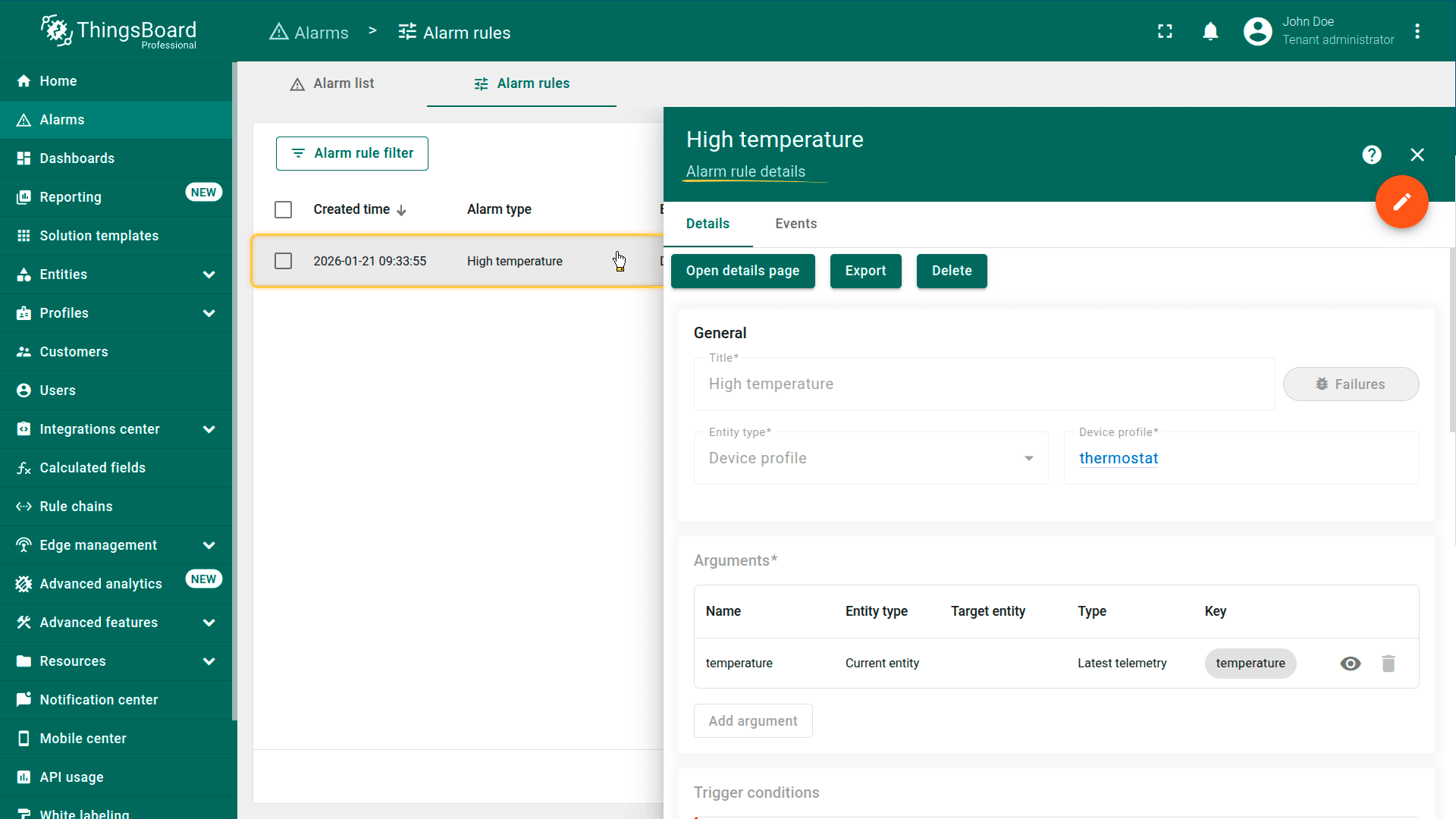 - Alarm type — the name and unique identifier of the alarm (for example, “High Temperature”). The alarm type defines which event the alarm represents and allows ThingsBoard to determine whether a new alarm should be created or an existing active one should be updated.