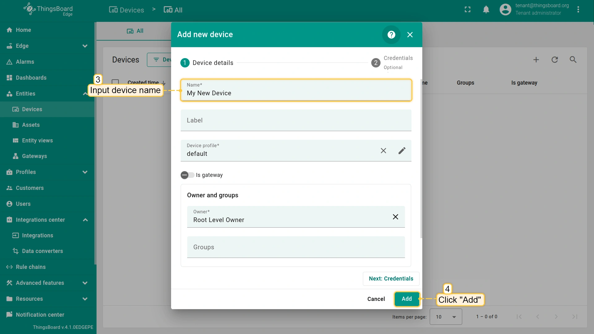 Log in to your ThingsBoard Edge instance and go to the Entities > Devices section. Click the “+” button in the top-right corner and select Add new device.