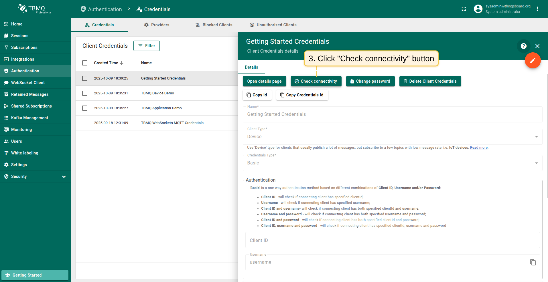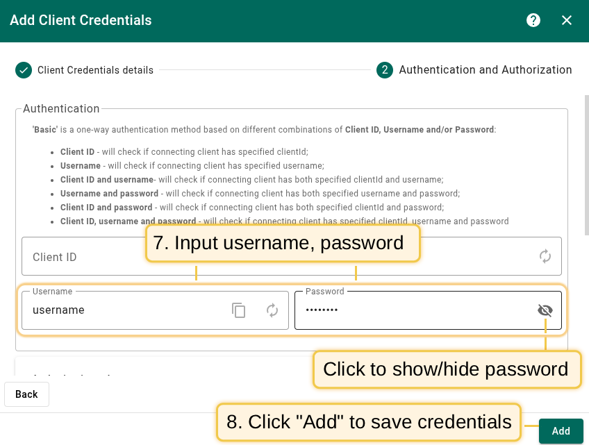Once Basic authentication is enabled, it is necessary to create MQTT Client Credentials of type Basic to authenticate and validate the connecting client.