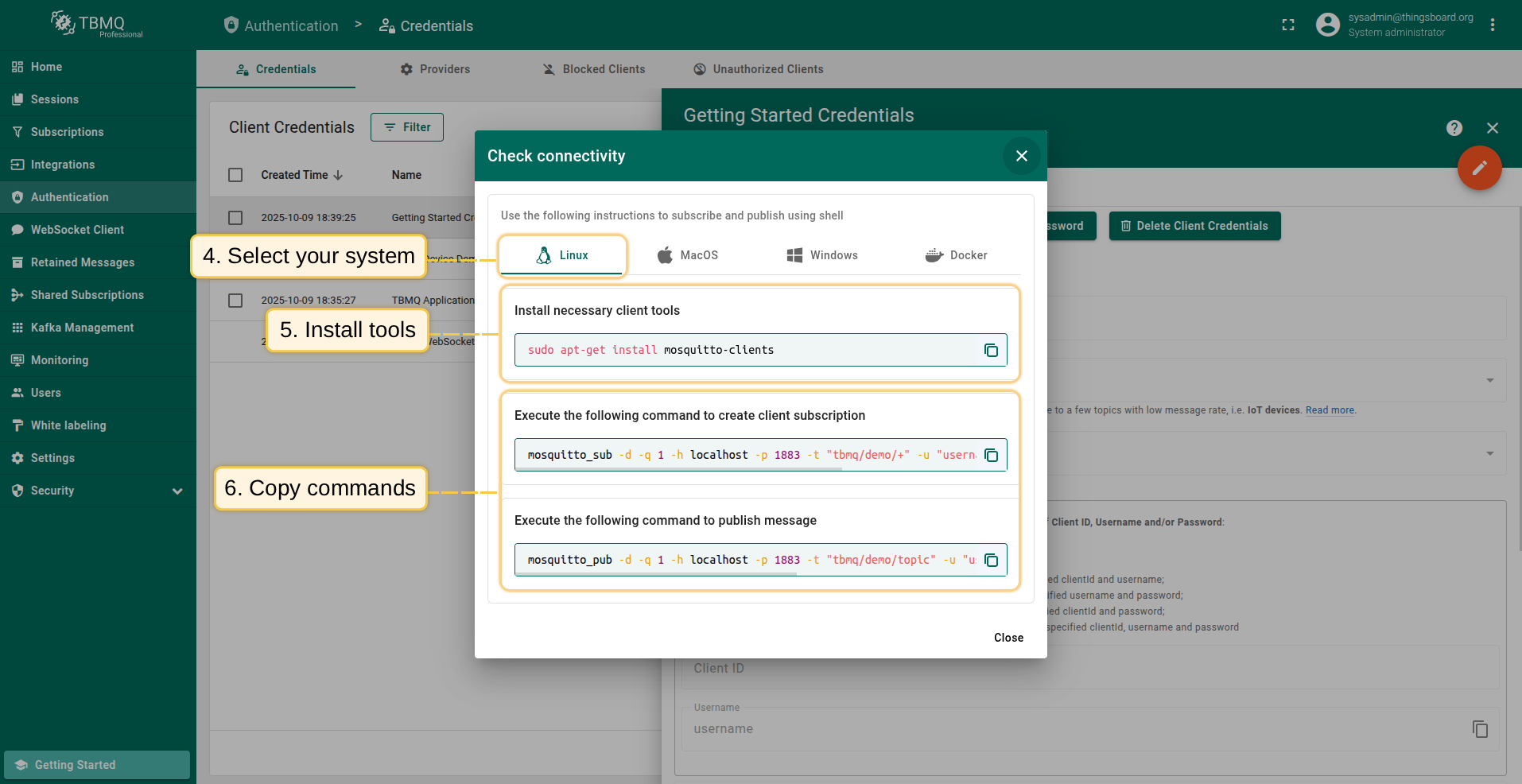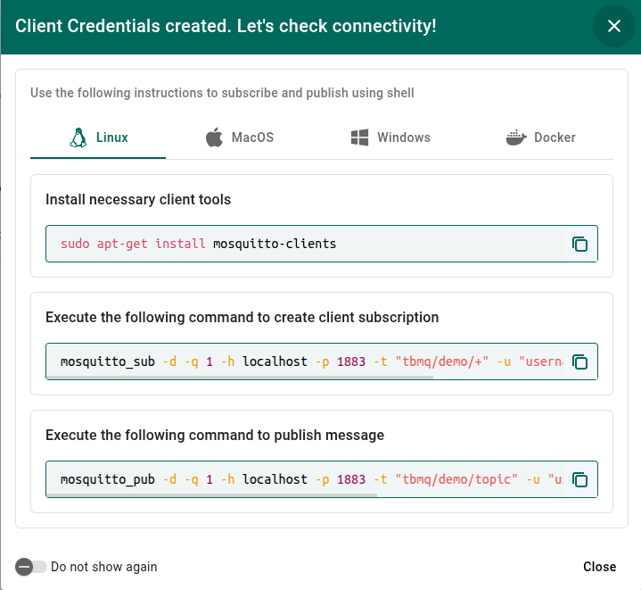This tool uses your host, port, and client credentials data to construct mosquitto_sub and mosquitto_pub commands. It is available only for the Basic client credentials type.