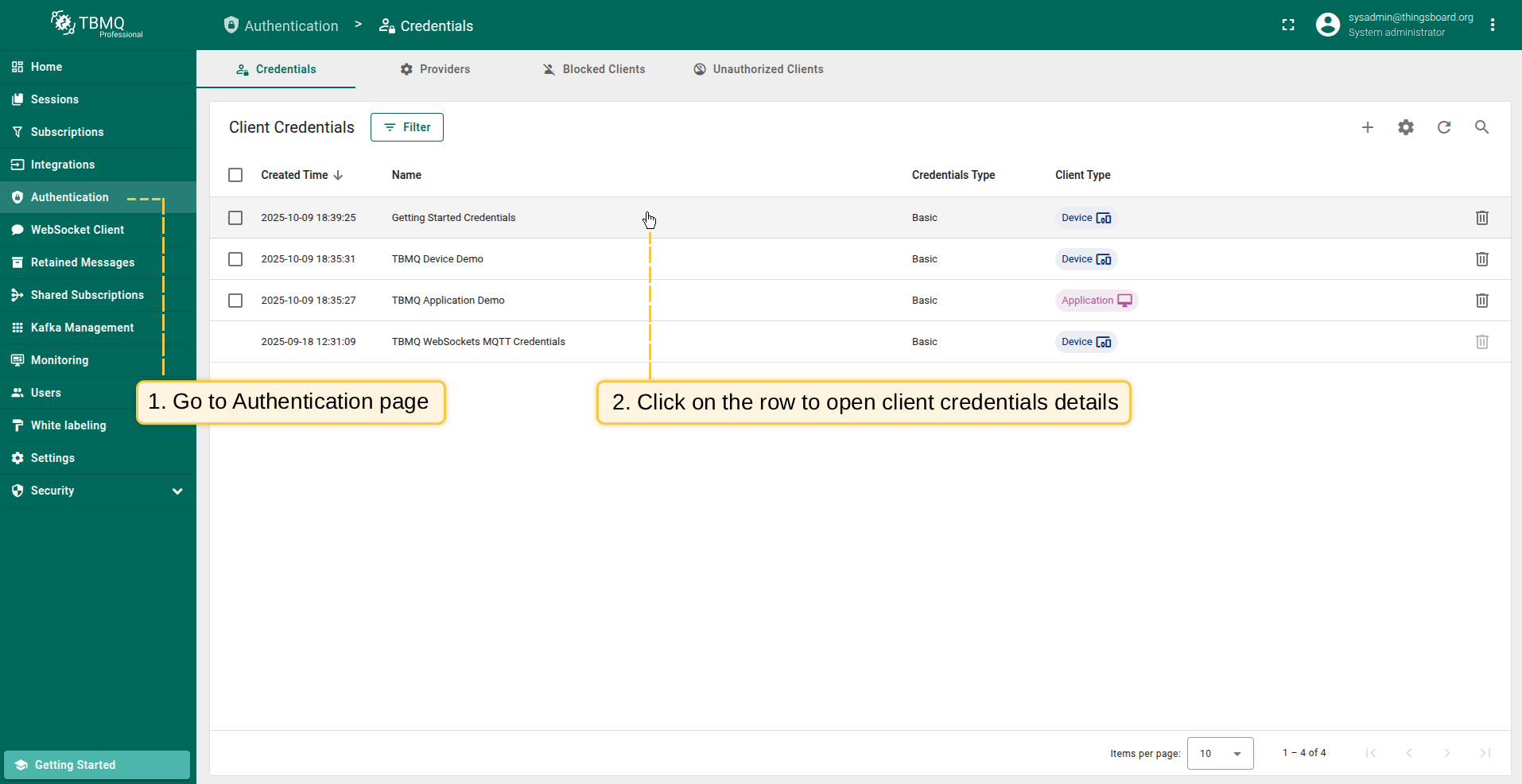 - Click on row with client credentials “Getting Started Credentials” to open the details.