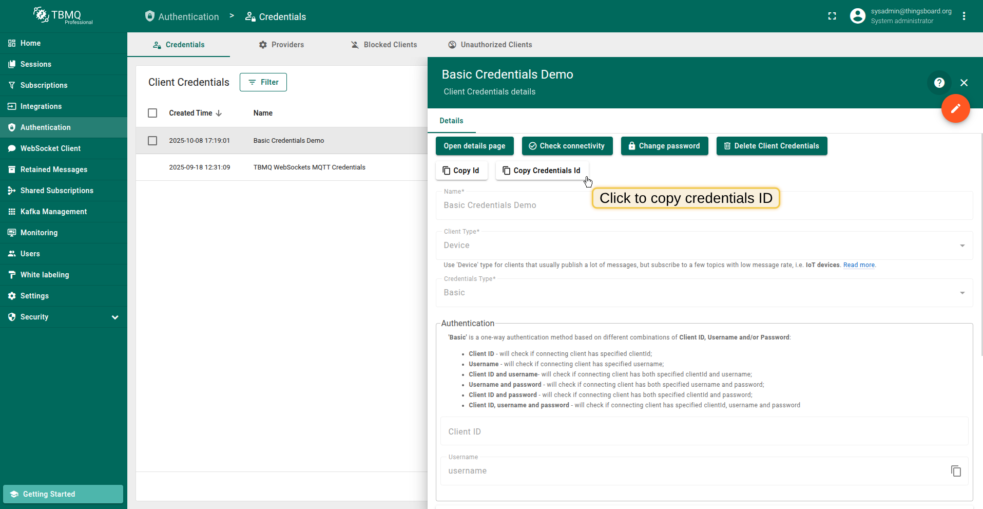 TBMQ uses these credentials to generate a unique credentialsId and match against the stored MQTT client credential records using flexible matching strategies.