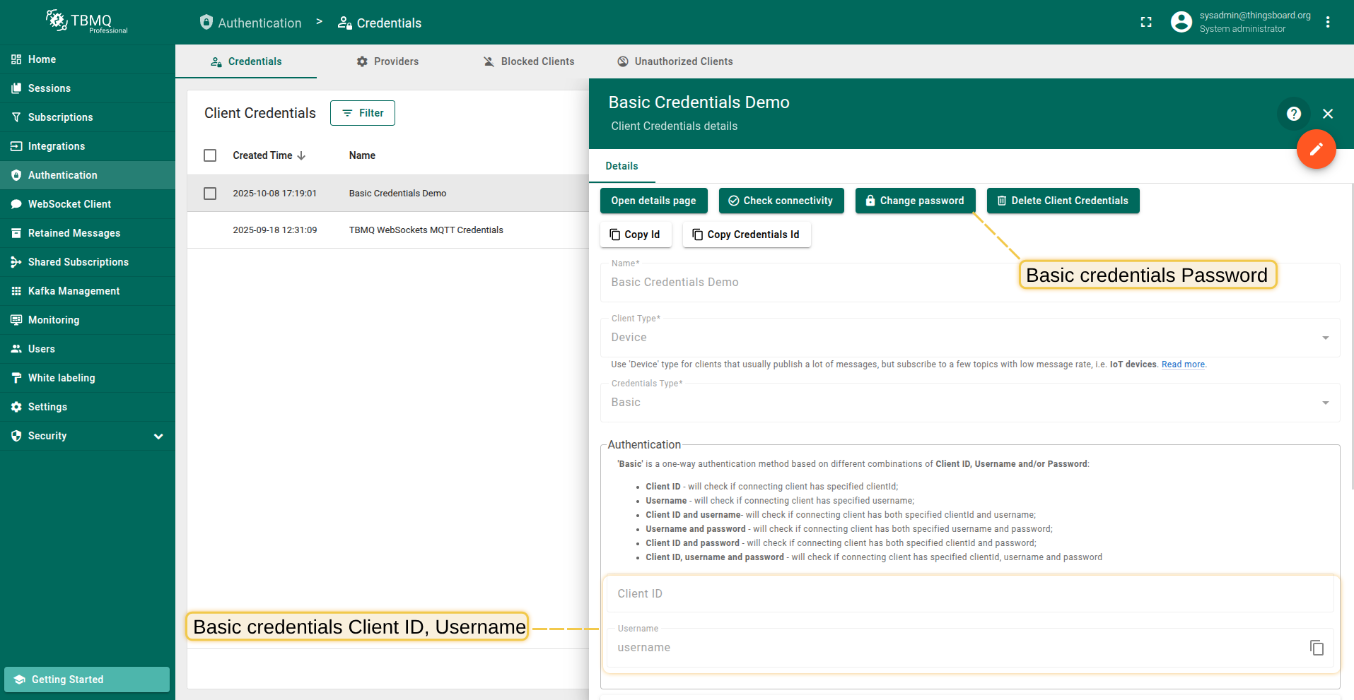 Basic authentication allows MQTT clients to authenticate using credentials sent in the CONNECT packet — such as clientId, username, and password.