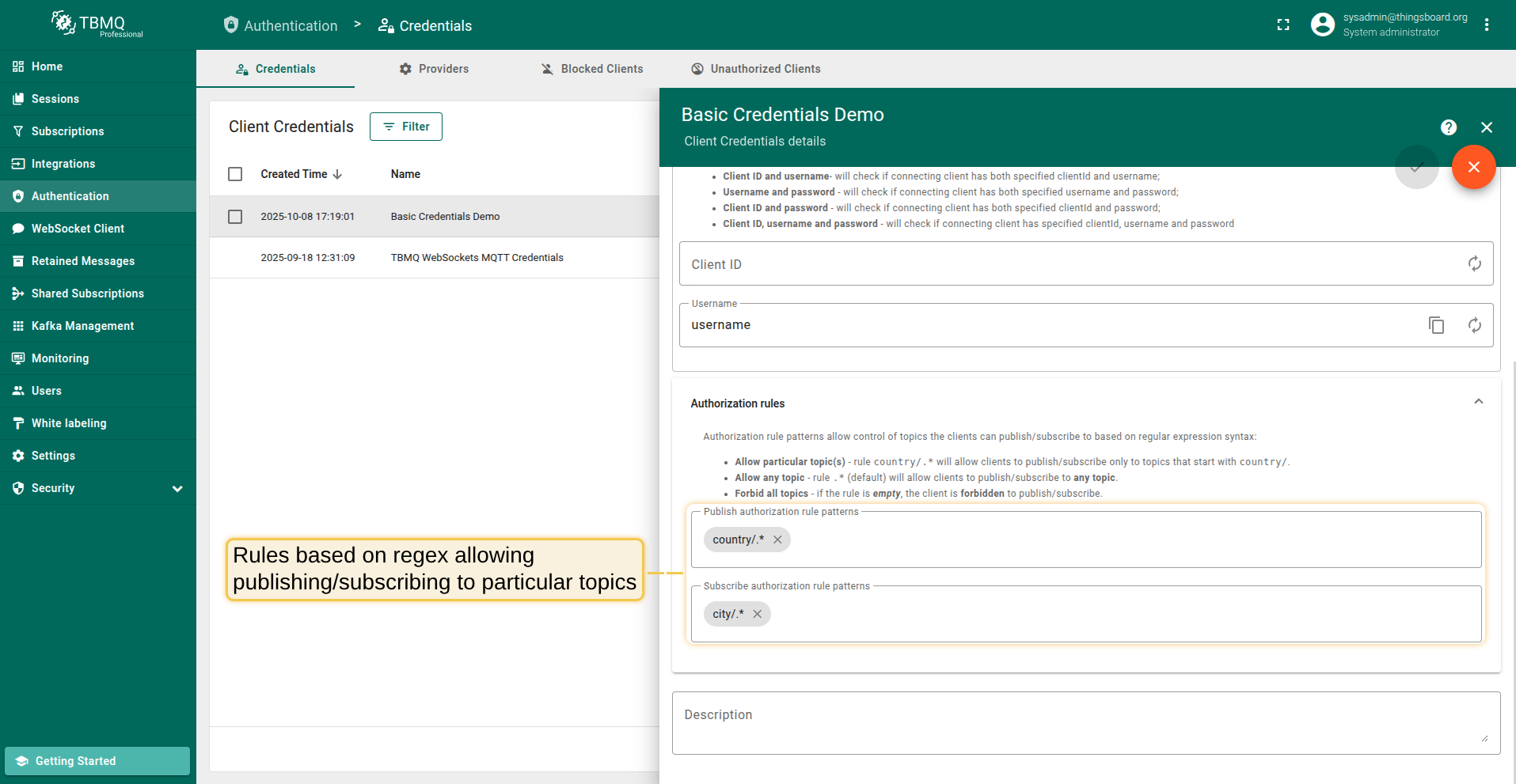 To provide flexible control over authorization rules, TBMQ uses regular expressions.