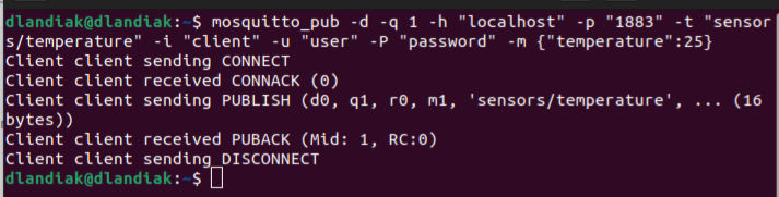 Let’s review a simple command to publish message using MQTT client ID, username and password to the TBMQ. The command is using plain MQTT without TLS: