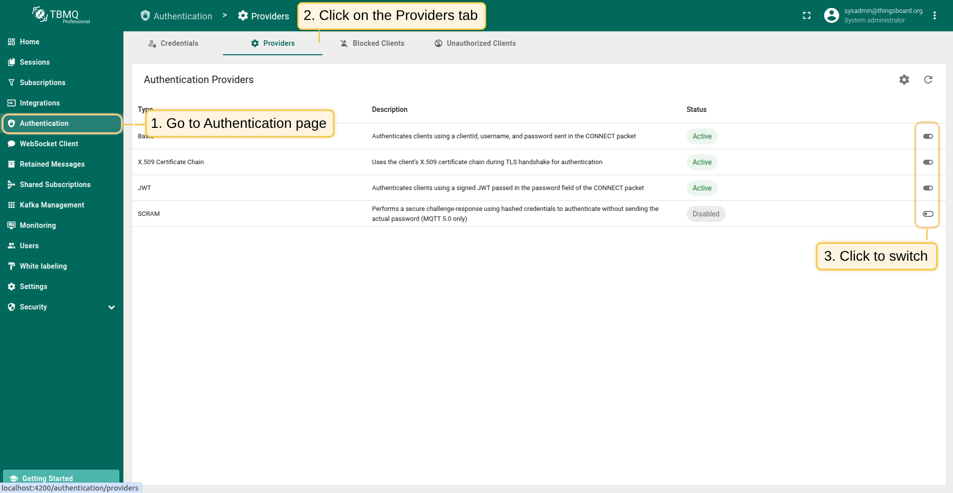 You can check the authentication provider status, enable or disable it directly from the TBMQ user interface, making it easy to manage authentication behavior without modifying configuration files or restarting the broker.