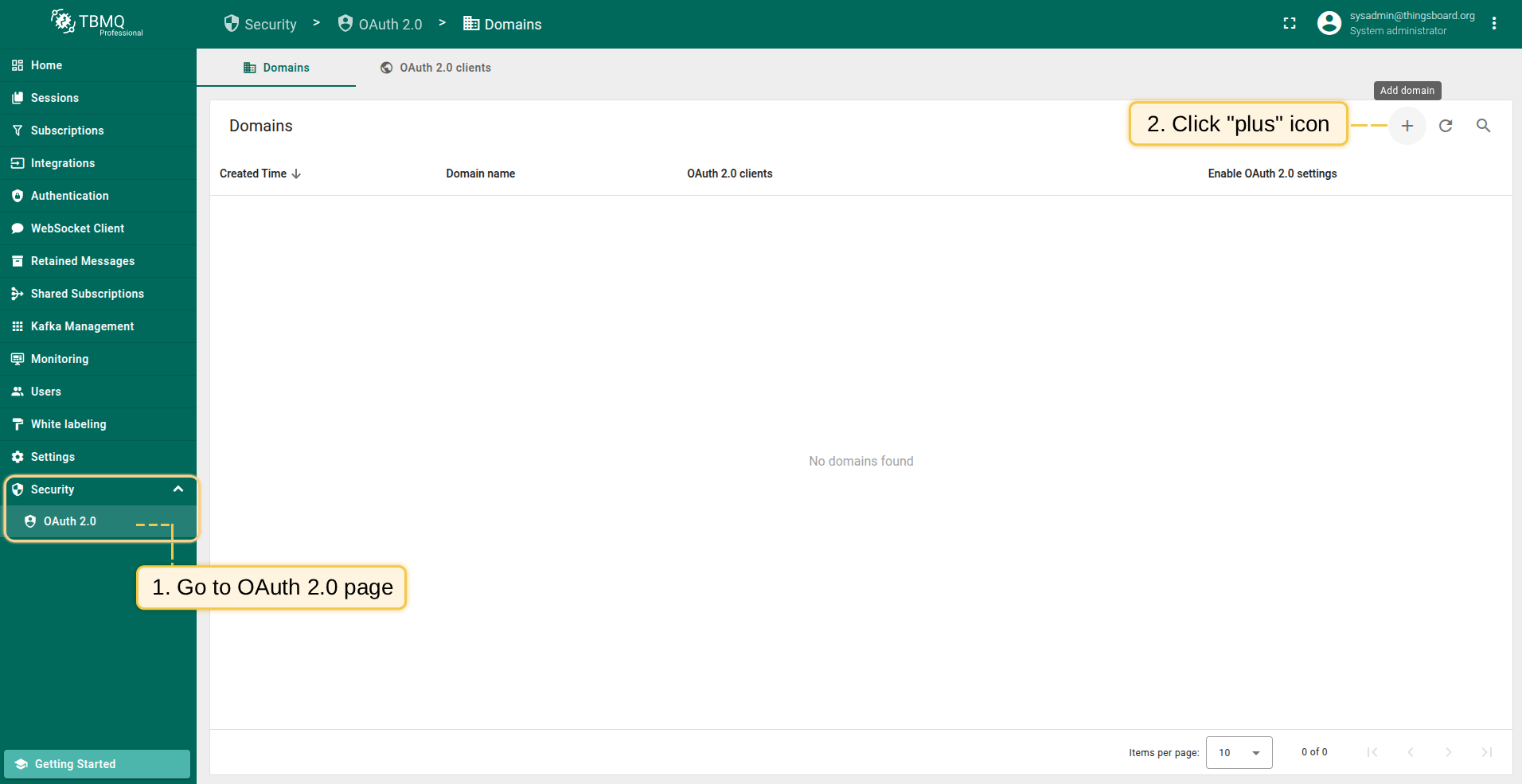 - On the “Domains” tab of the “OAuth 2.0” page, click the “plus” icon to add a new domain;
