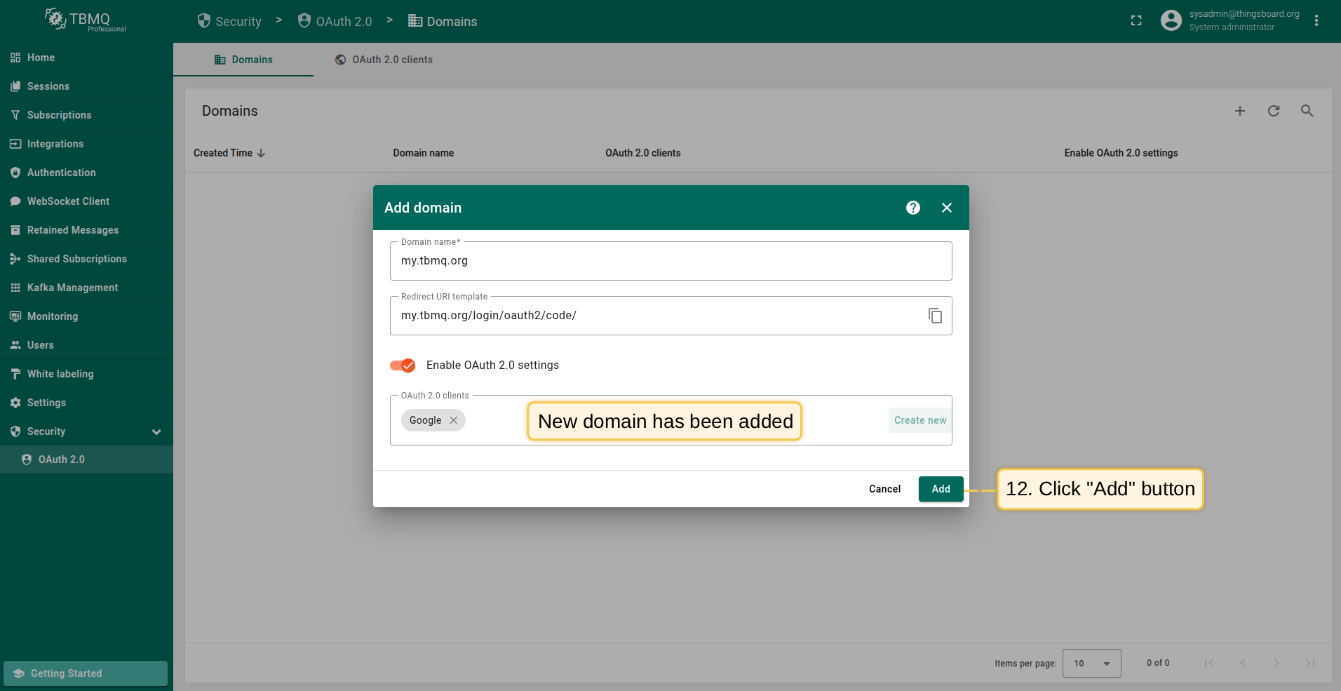 - The OAuth client has been added successfully. Click “Add” again to confirm the addition of the domain.