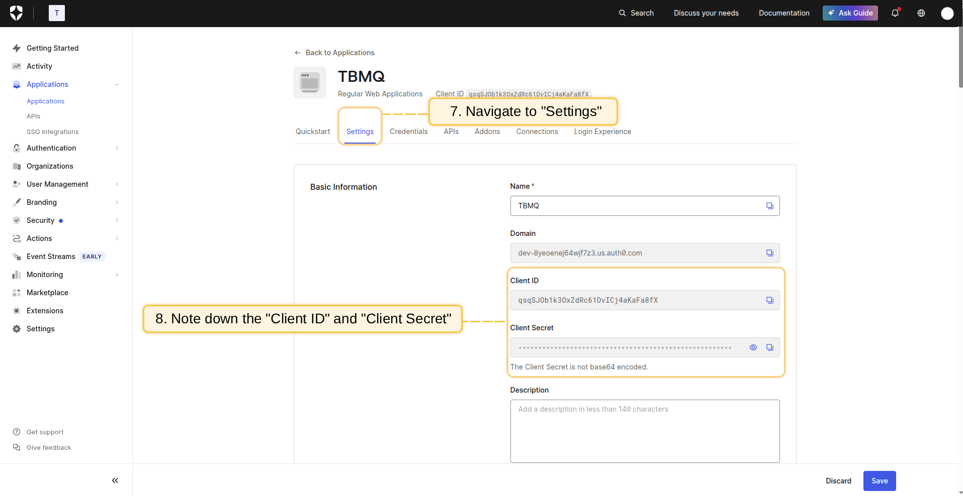 - Once your application is created, you are redirected to the application details page. Navigate to the Settings tab to find the Client ID and Client Secret;