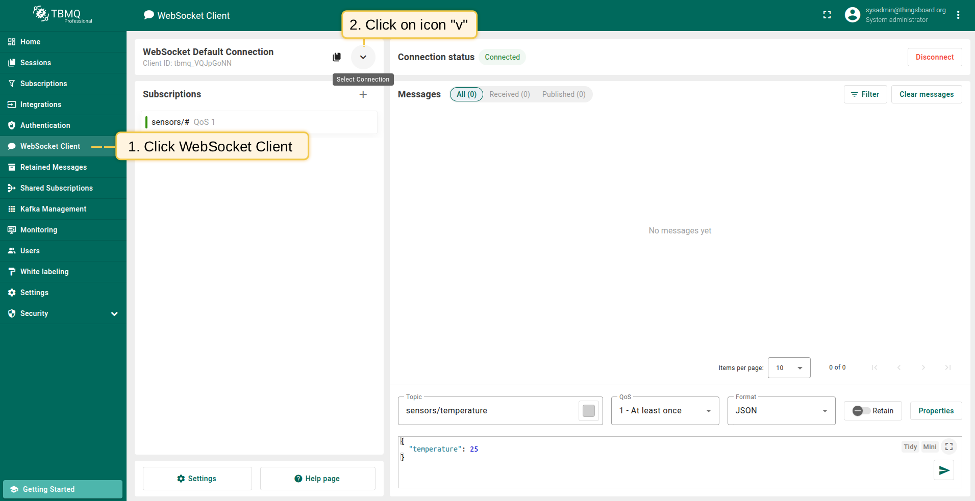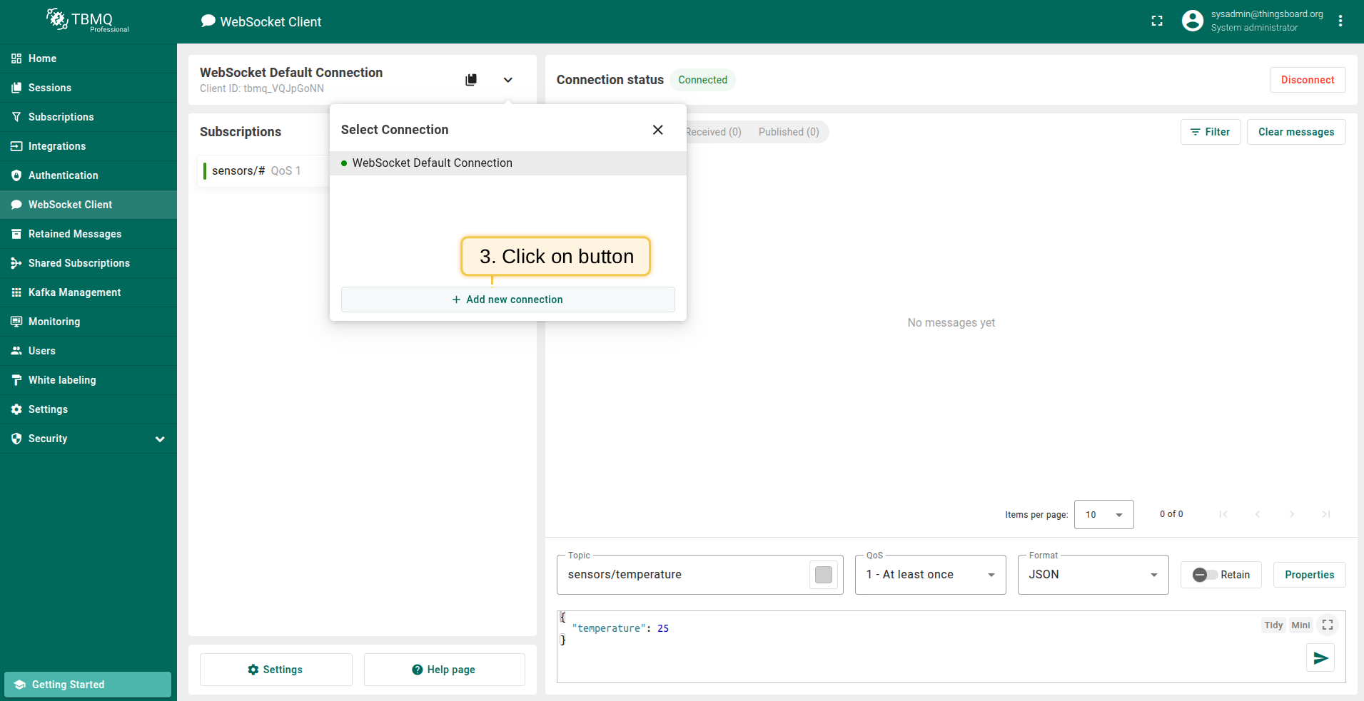 - Navigate to the WebSocket Client page and click on Select Connection icon.