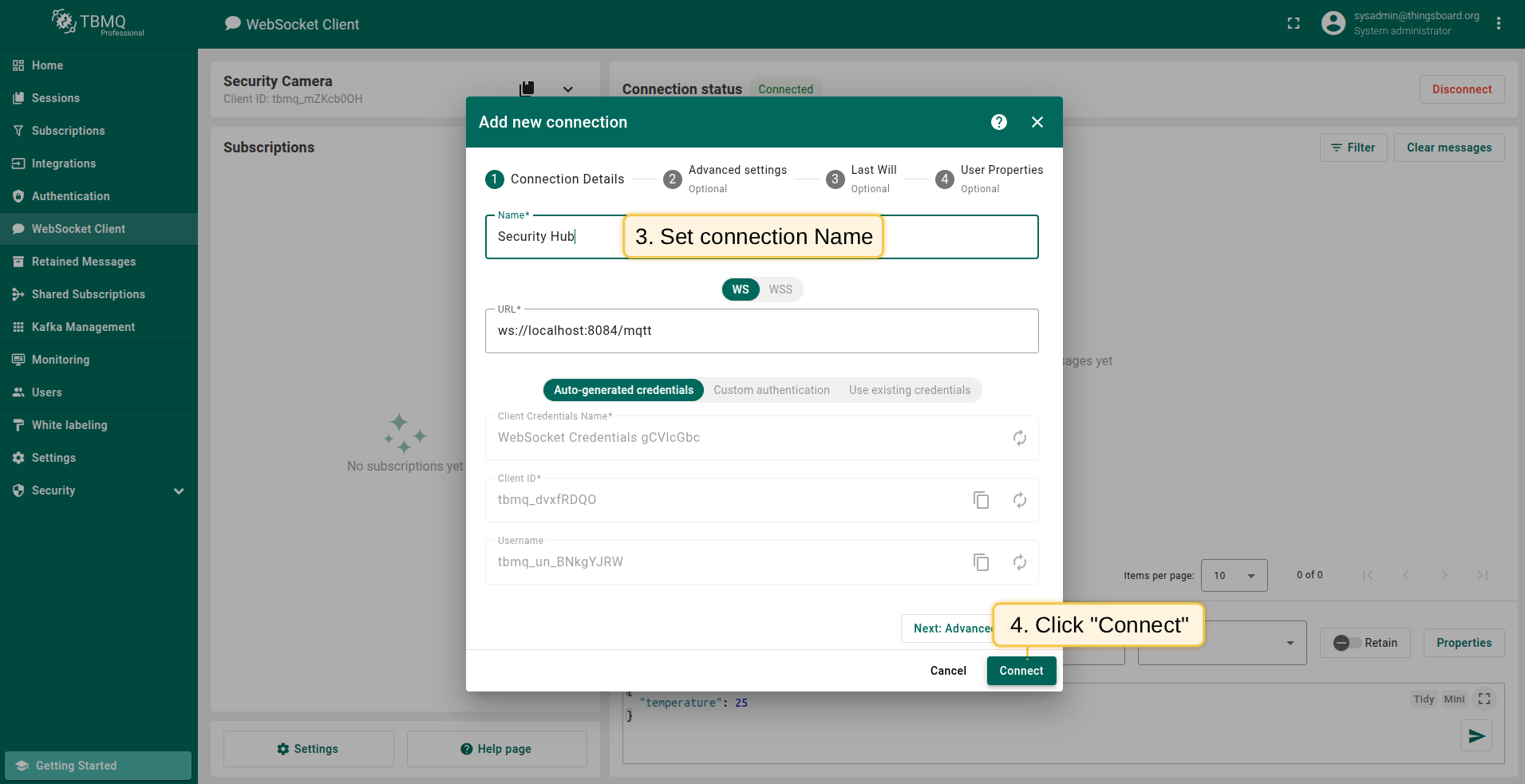 To add a new client Security Camera, which will publish a Last Will message, follow these steps: