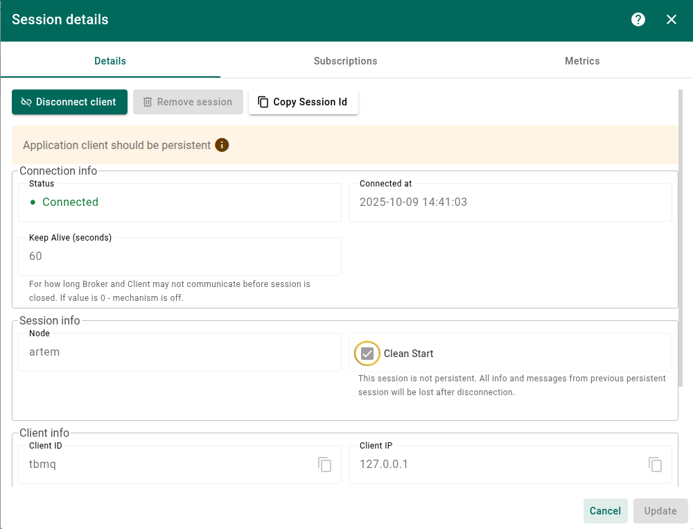 While TBMQ is designed with the assumption that APPLICATION clients require persistence, this behavior is not strictly enforced. If a client is authenticated as an APPLICATION type but initiates a non-persistent session, messages will still be delivered to the client; however, no additional persistence mechanisms will be applied. This means messages may be lost if the client disconnects or becomes unavailable during delivery. To alert about the implications of non-persistent APPLICATION clients, a warning message is displayed prominently on the client session details page.
