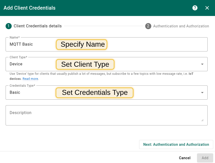 - Device. Use for clients that usually publish a lot of messages, but subscribe to a few topics with low message rate, i.e. IoT devices.