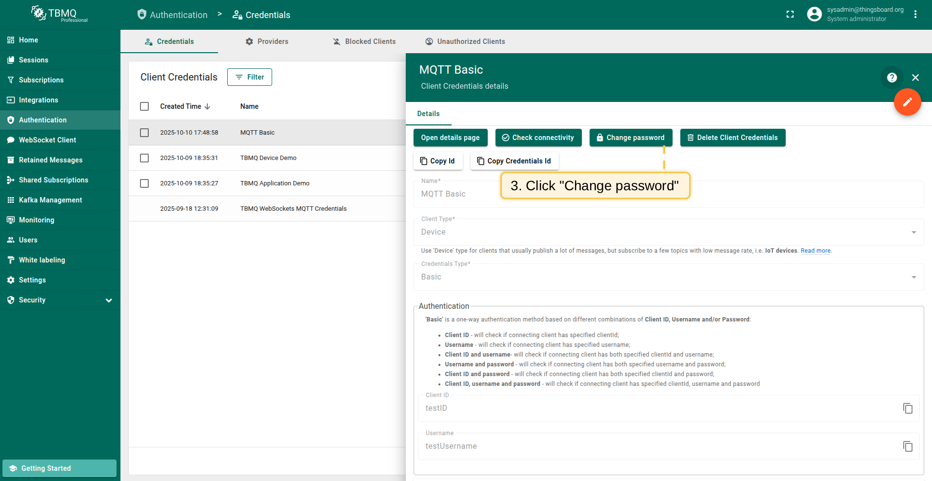 Broker administrators can modify the password for MQTT Basic client credentials. To do this, follow these instructions: