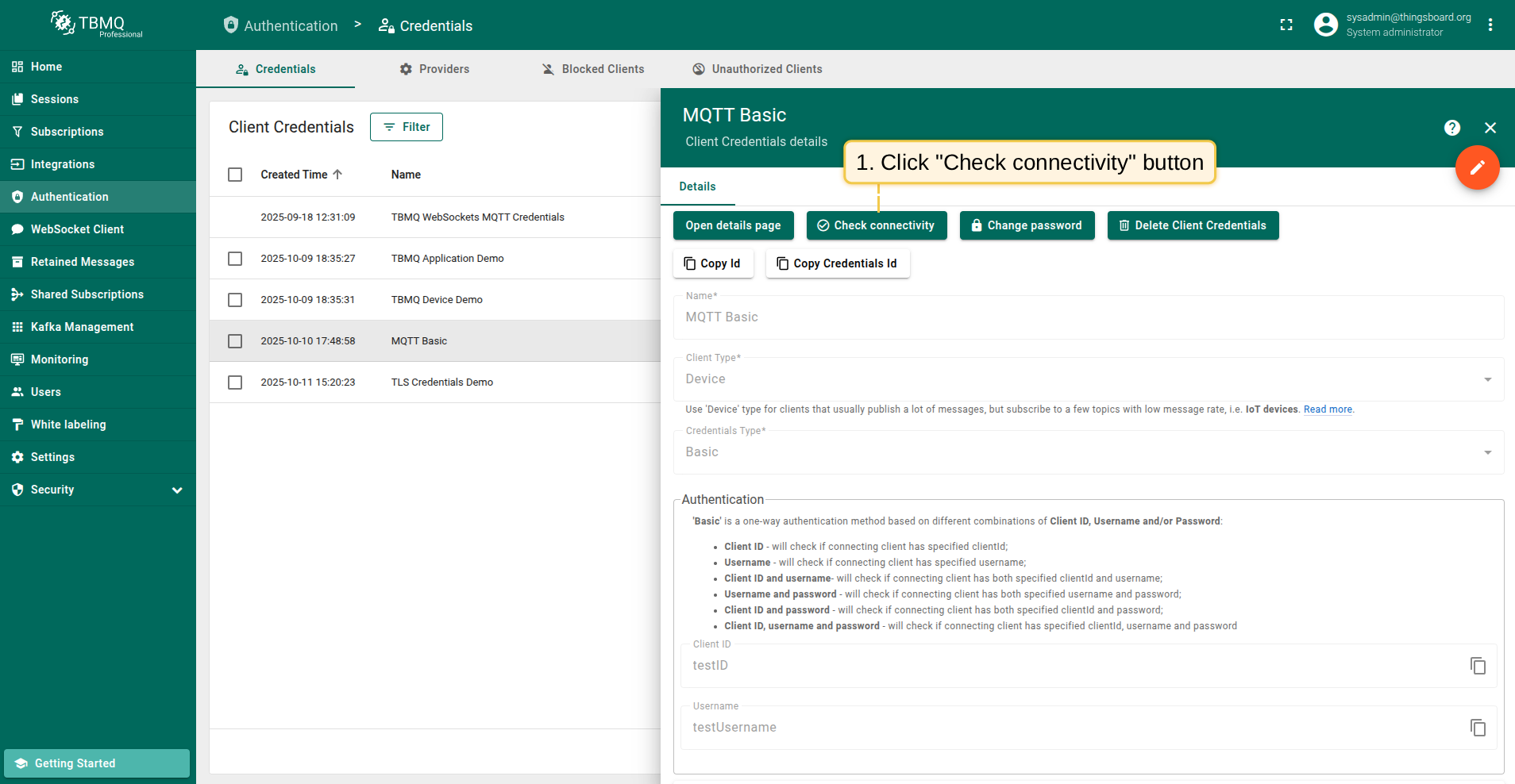 - Client ID, username and password - verifies if the connecting client has specified clientId, username, and password.