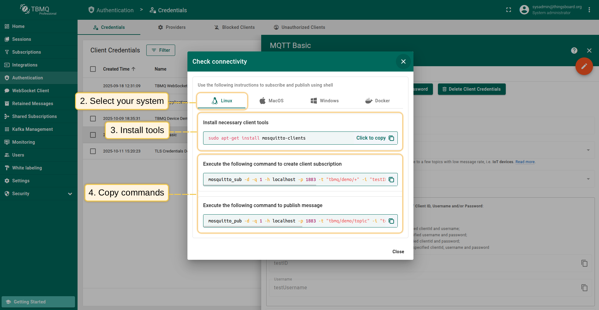 “Check Connectivity” is a useful tool that automatically generates commands to subscribe to a topic and publish a message. This feature utilizes the user’s host, port, and client credentials to generate the necessary commands.