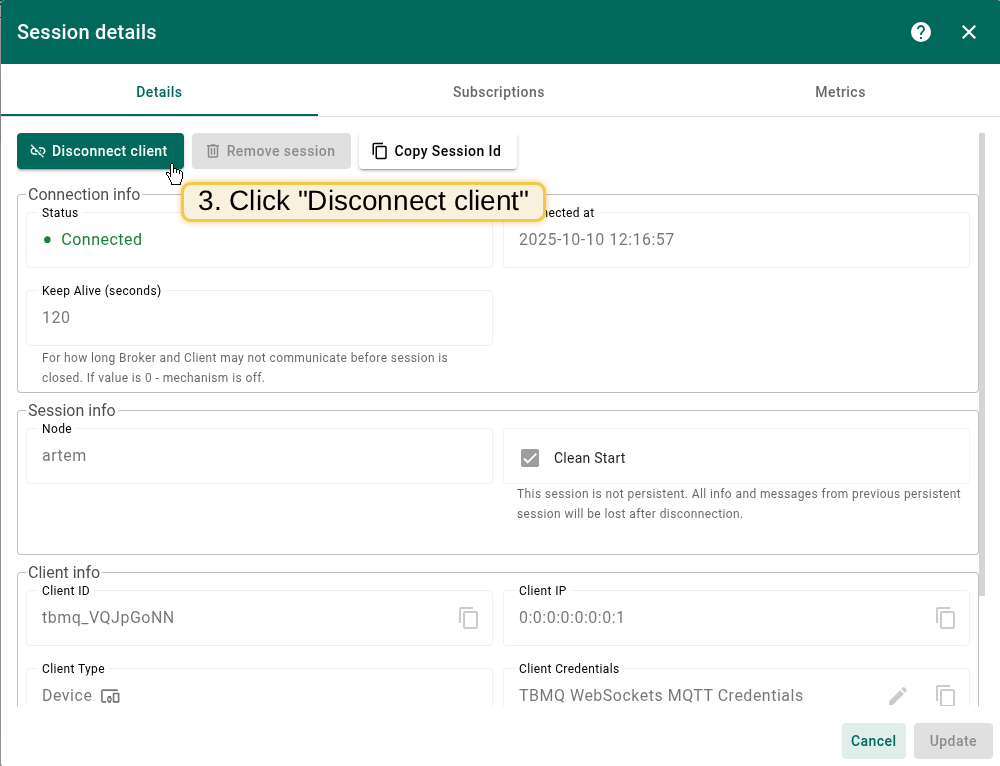 To access the detailed information of the current TBMQ sessions, please follow these steps: