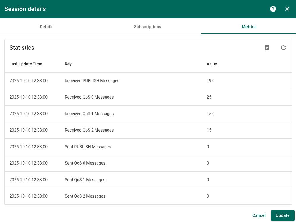 The Metrics tab provide detailed insights into the flow of MQTT messages within the session that may be helpful in monitoring the performance and reliability of message delivery: