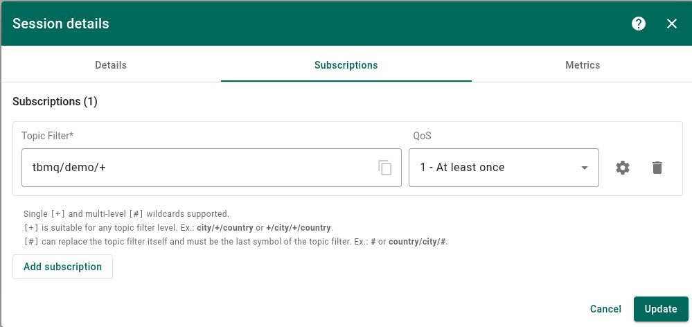 - To edit existing Topic filter or QoS, make the desired changes in the provided form and click the “Update” button.