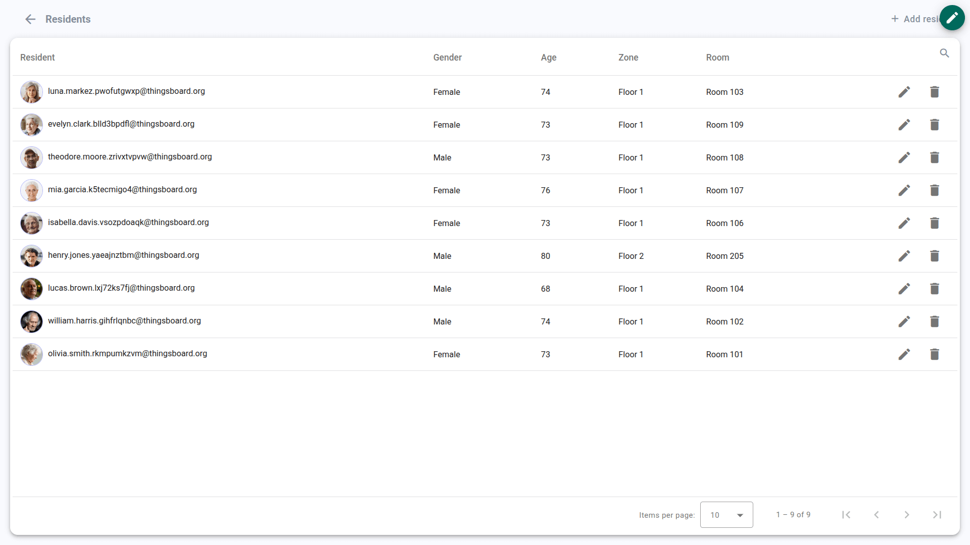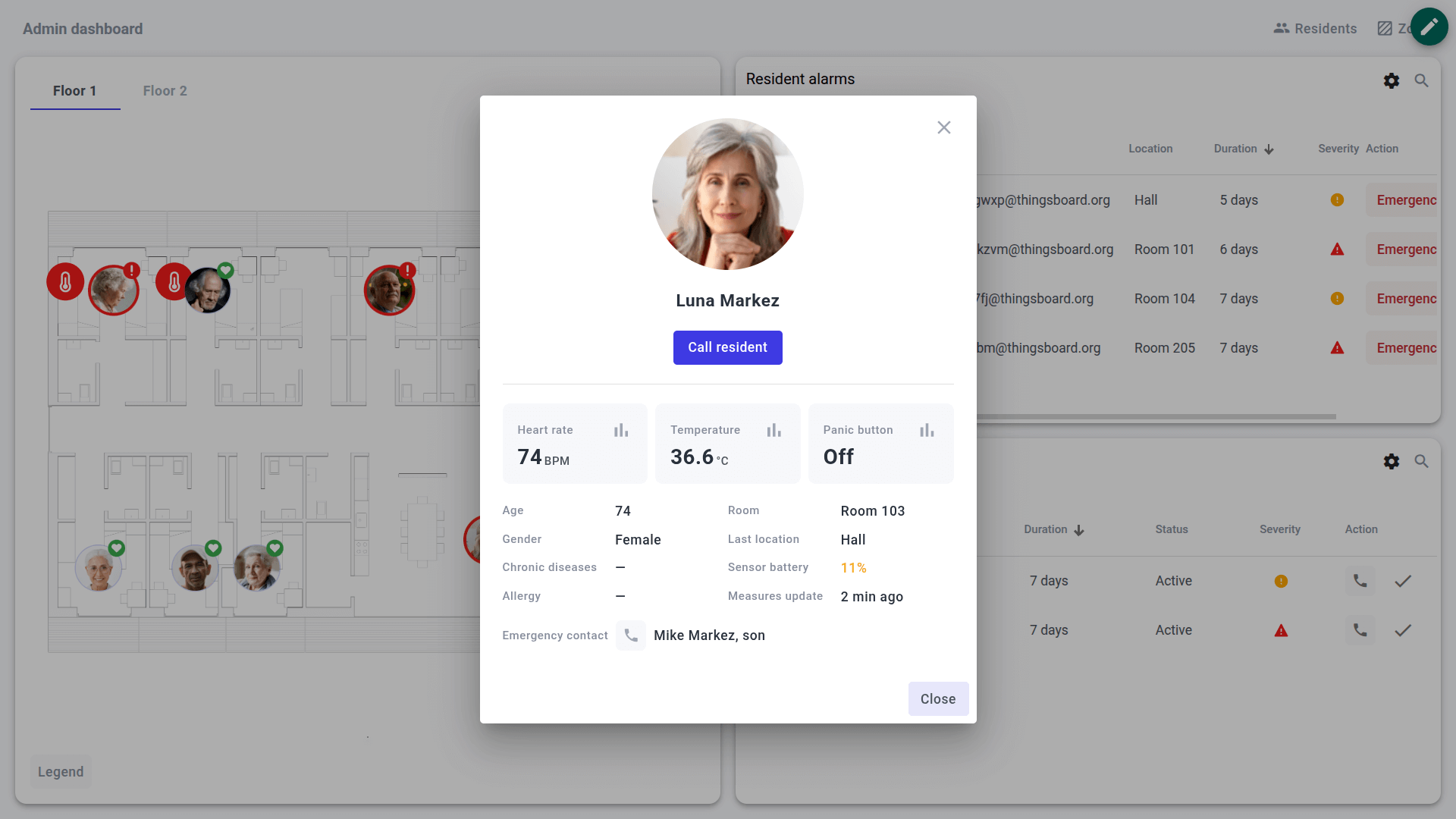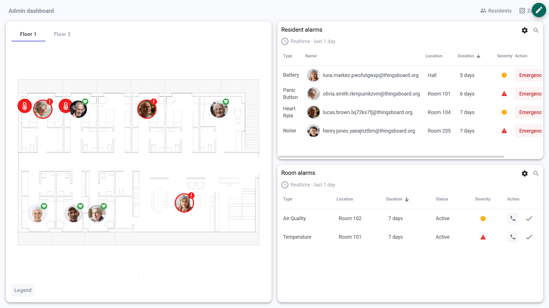 • Dashboard visualization – A facility administration dashboard for monitoring residents, rooms, alarms, and for managing zones/rooms/device assignments.