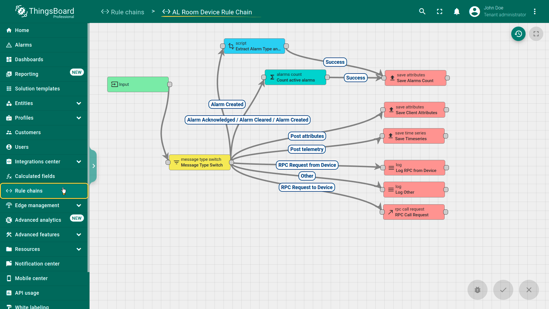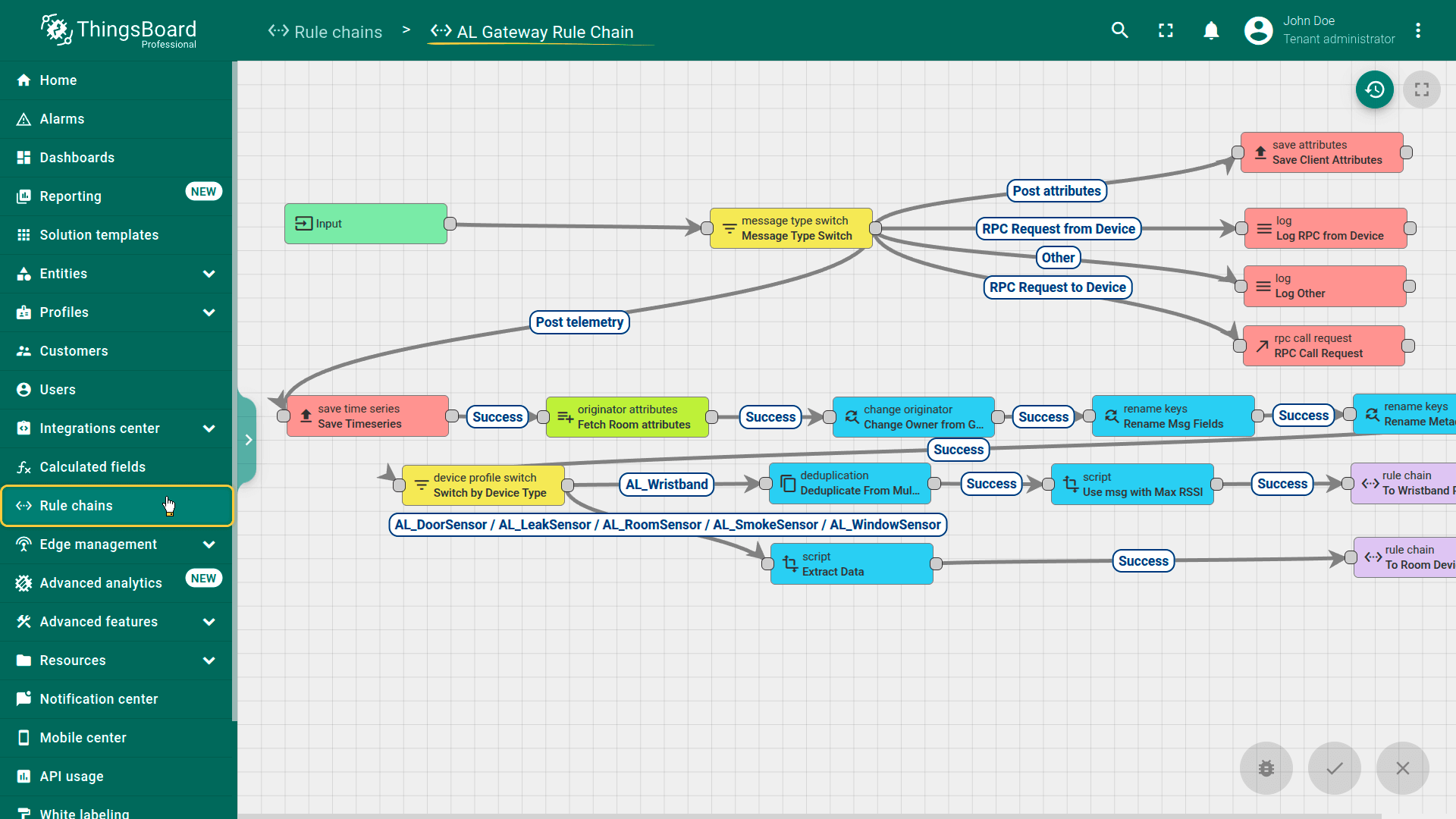 • AL Room Device Rule Chain – Saves telemetry and evaluates alarms for infrastructure sensors. Unlike the wristband chain, it does not propagate alarm counts to resident user entities.