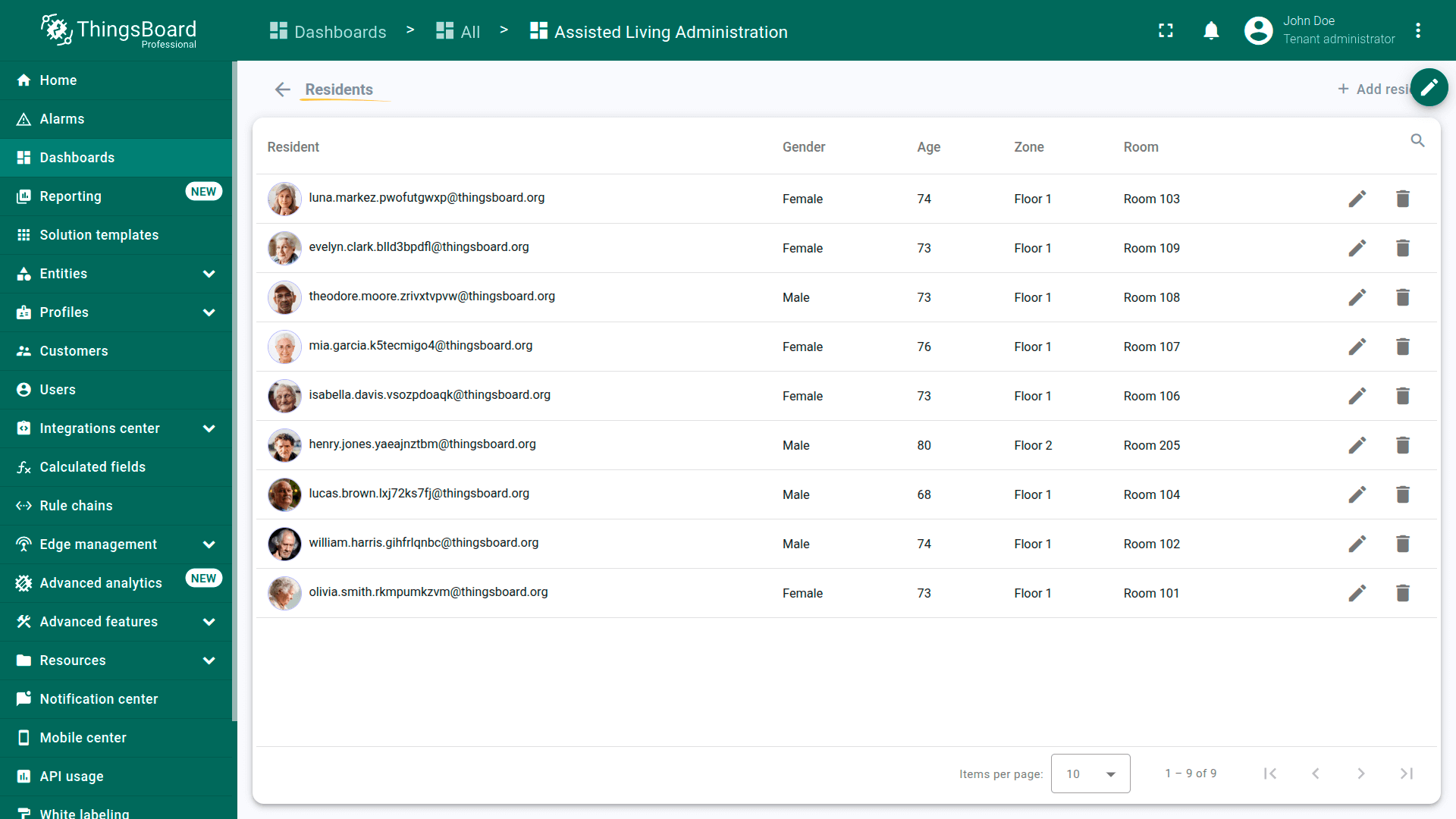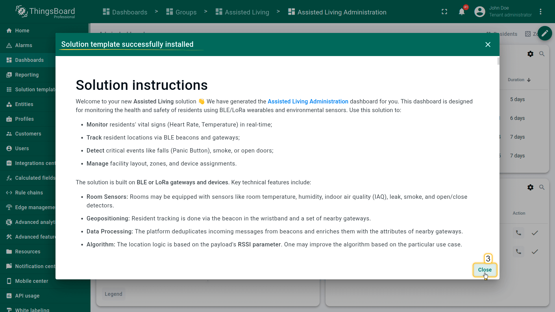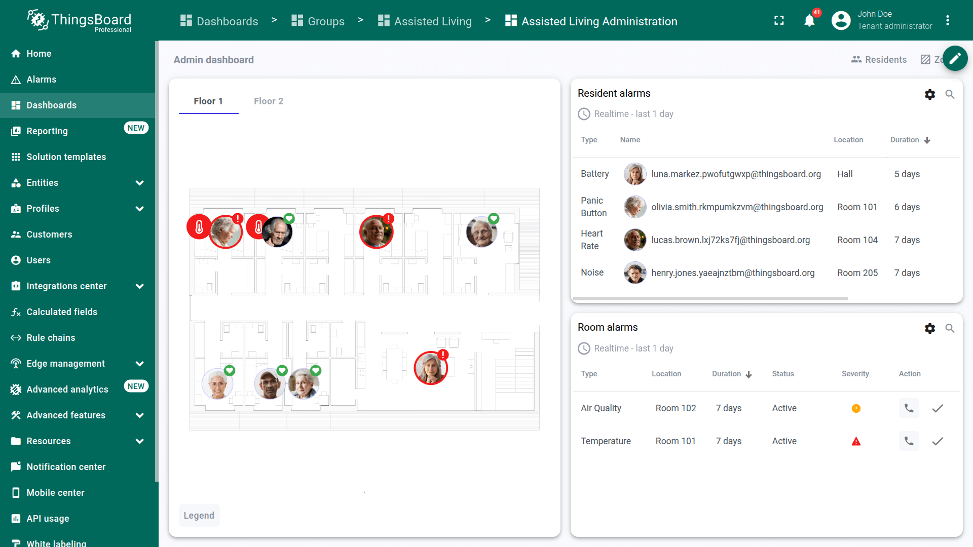 The Assisted Living solution demonstrates how ThingsBoard can be used to build an integrated resident safety and facility monitoring platform. By combining wearable telemetry, room sensor data, RSSI-based indoor positioning, and alarm-driven workflows, the solution enables care staff to respond to emergencies faster, maintain comfortable living conditions, and manage facility structure and device assignments from a single administration dashboard.