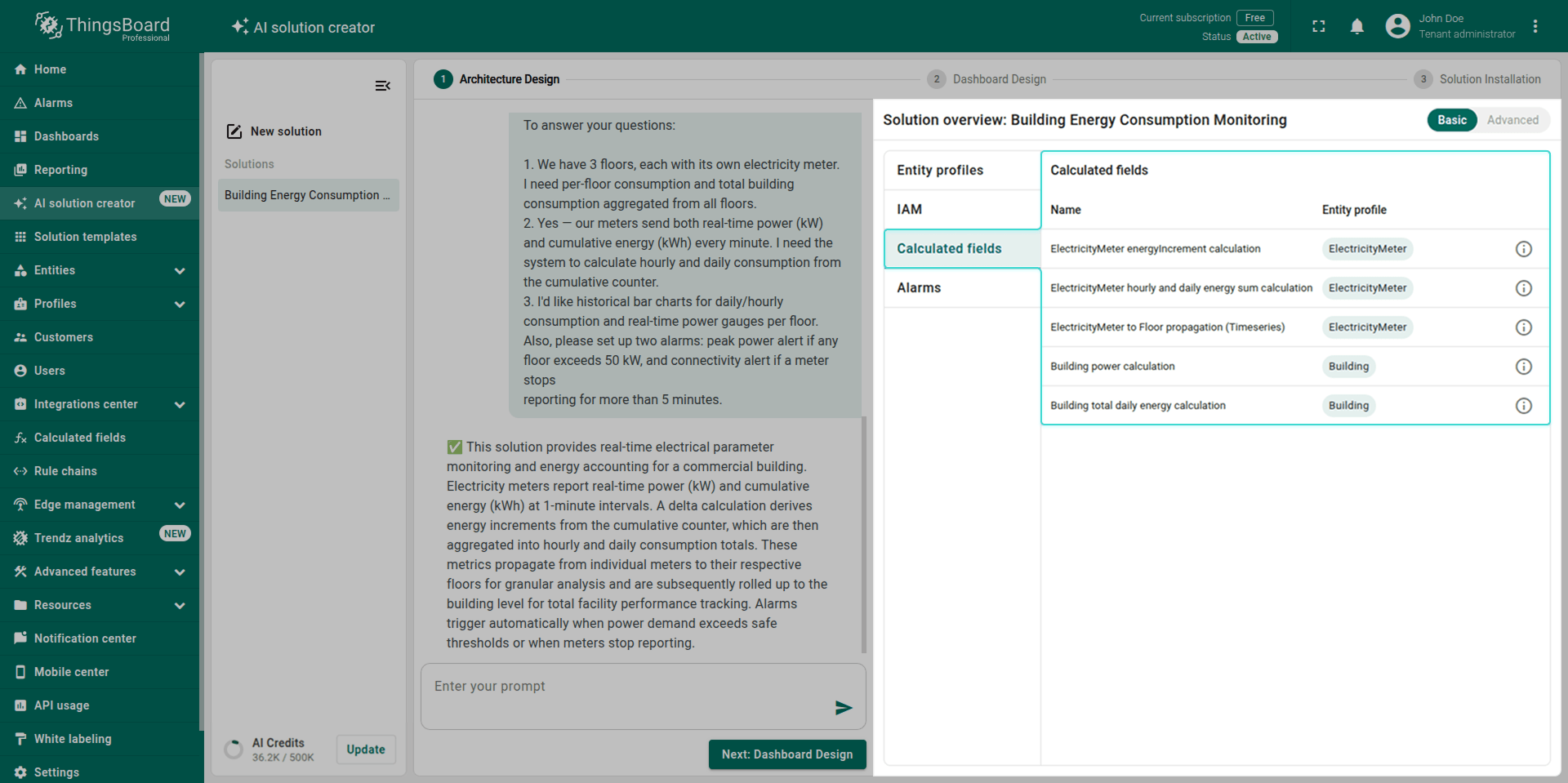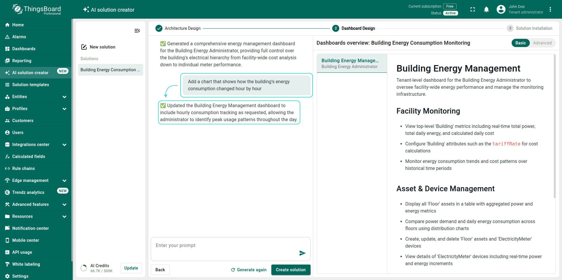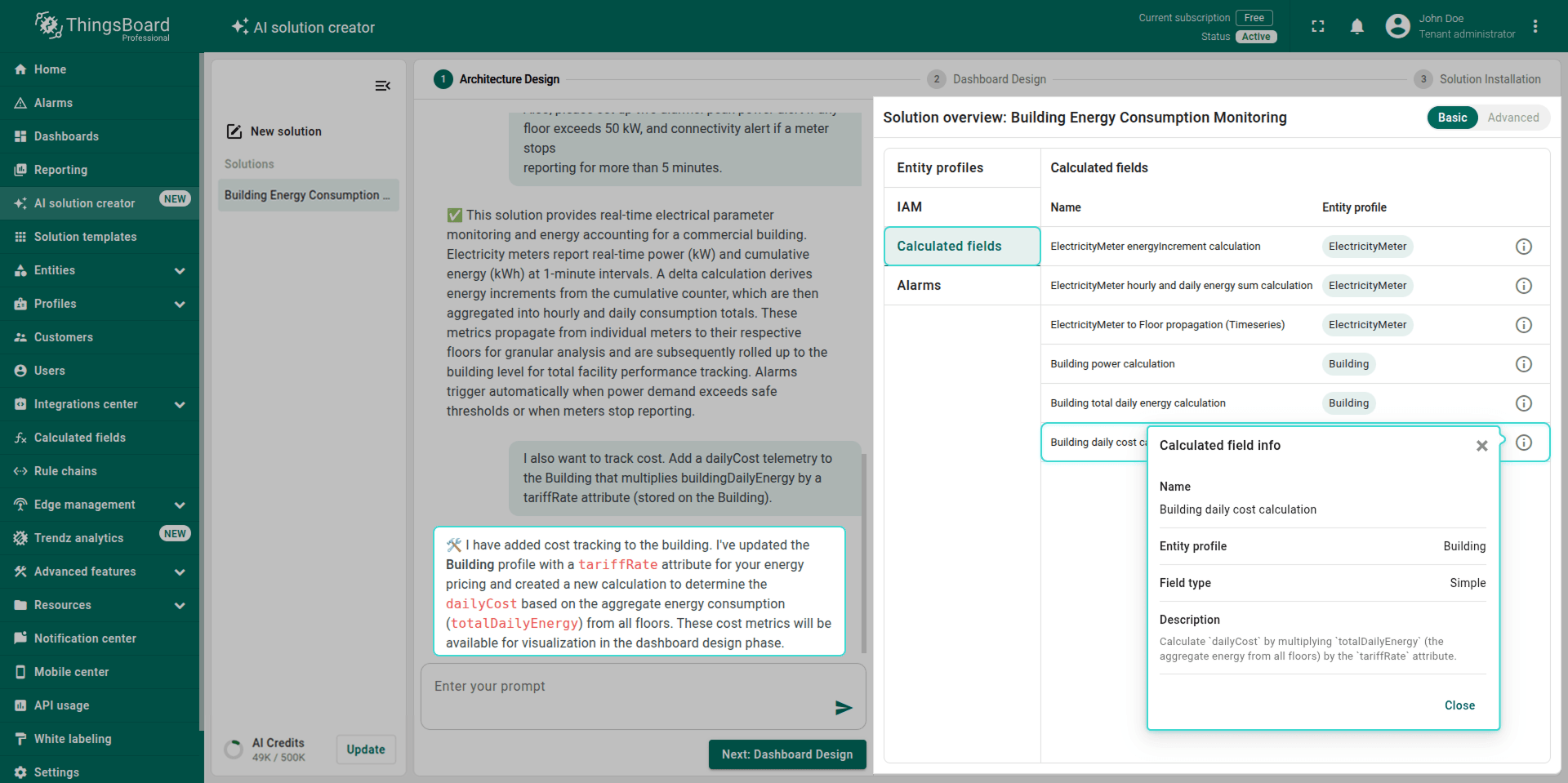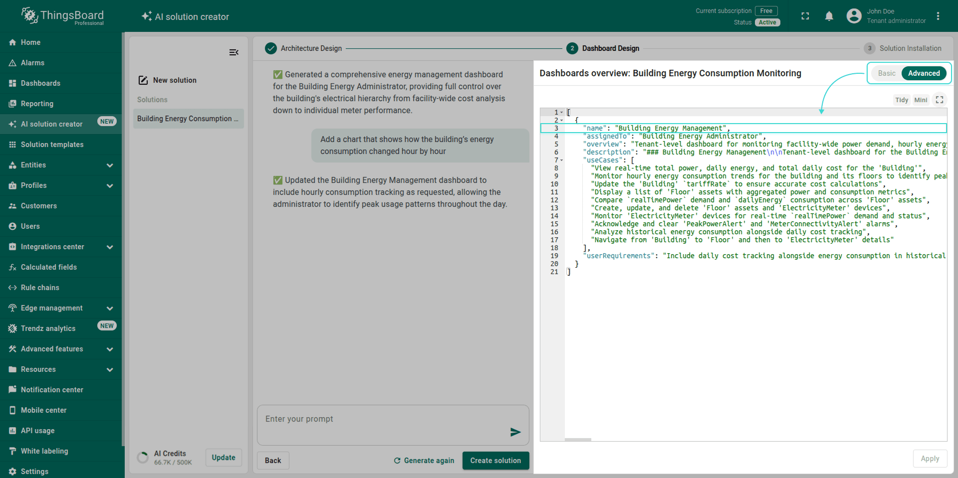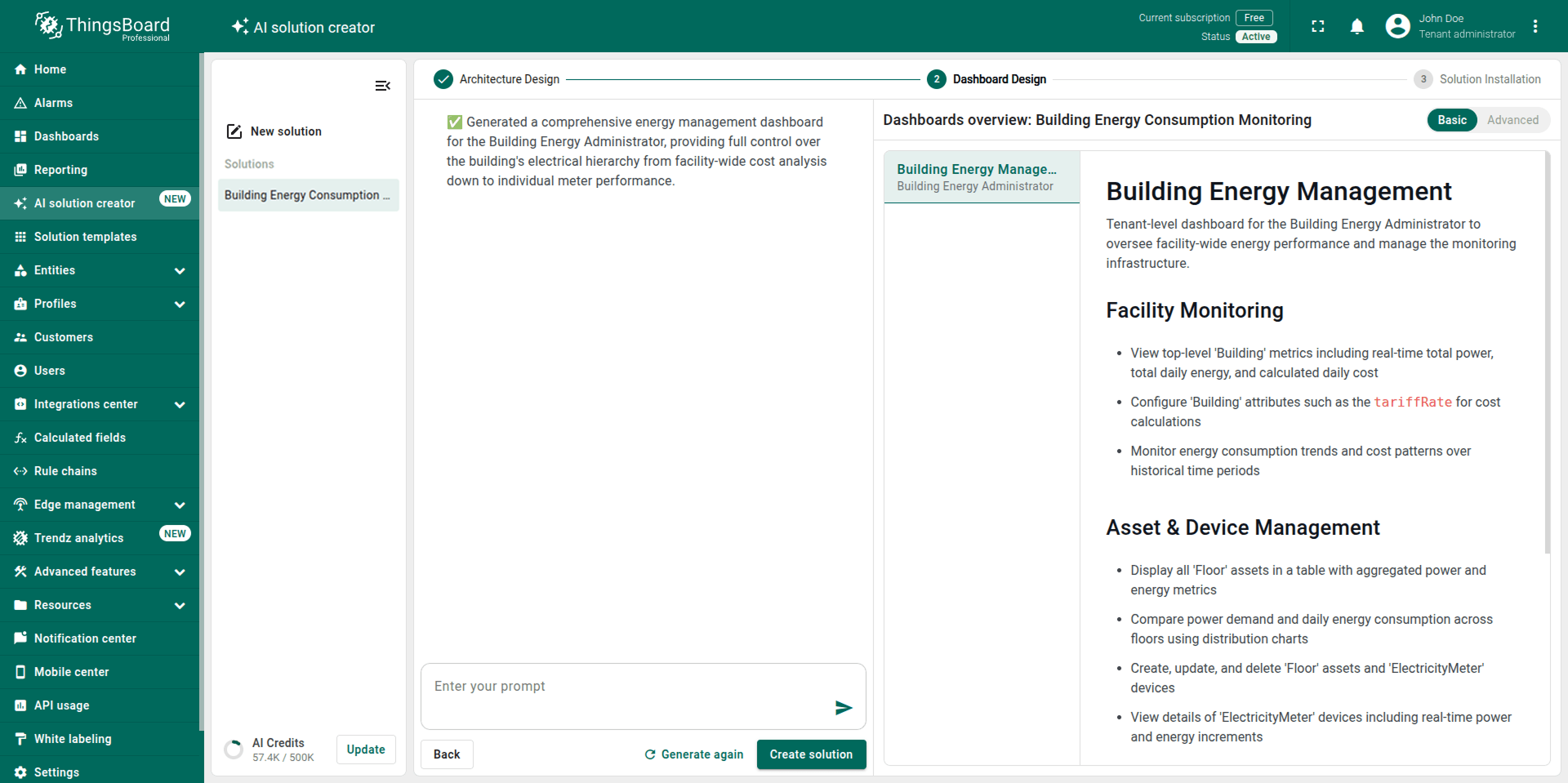 Note: The generated solution is a foundational prototype. You can modify any part of it (profiles, dashboards, alarm rules, calculated fields) using the standard ThingsBoard UI.