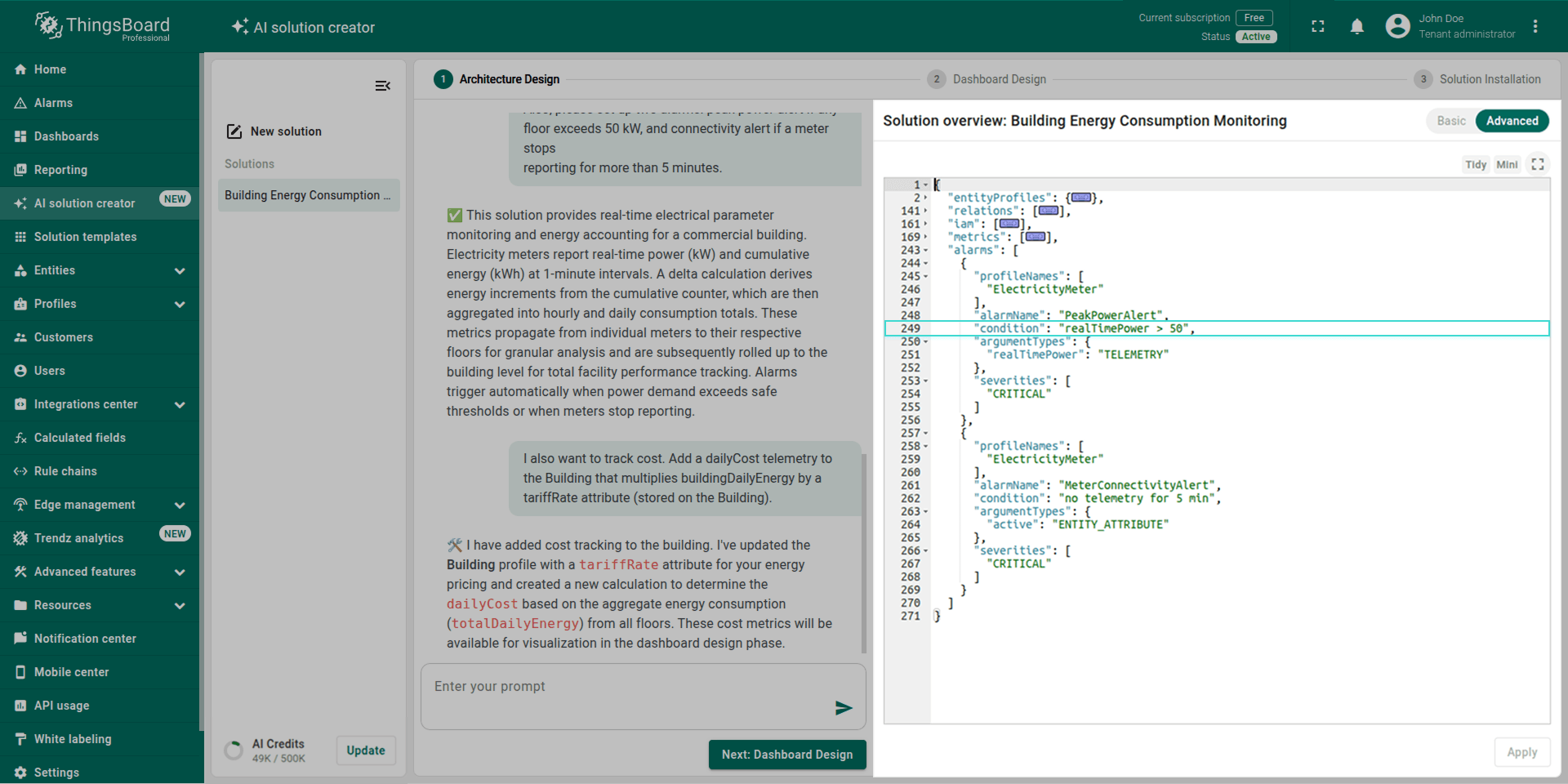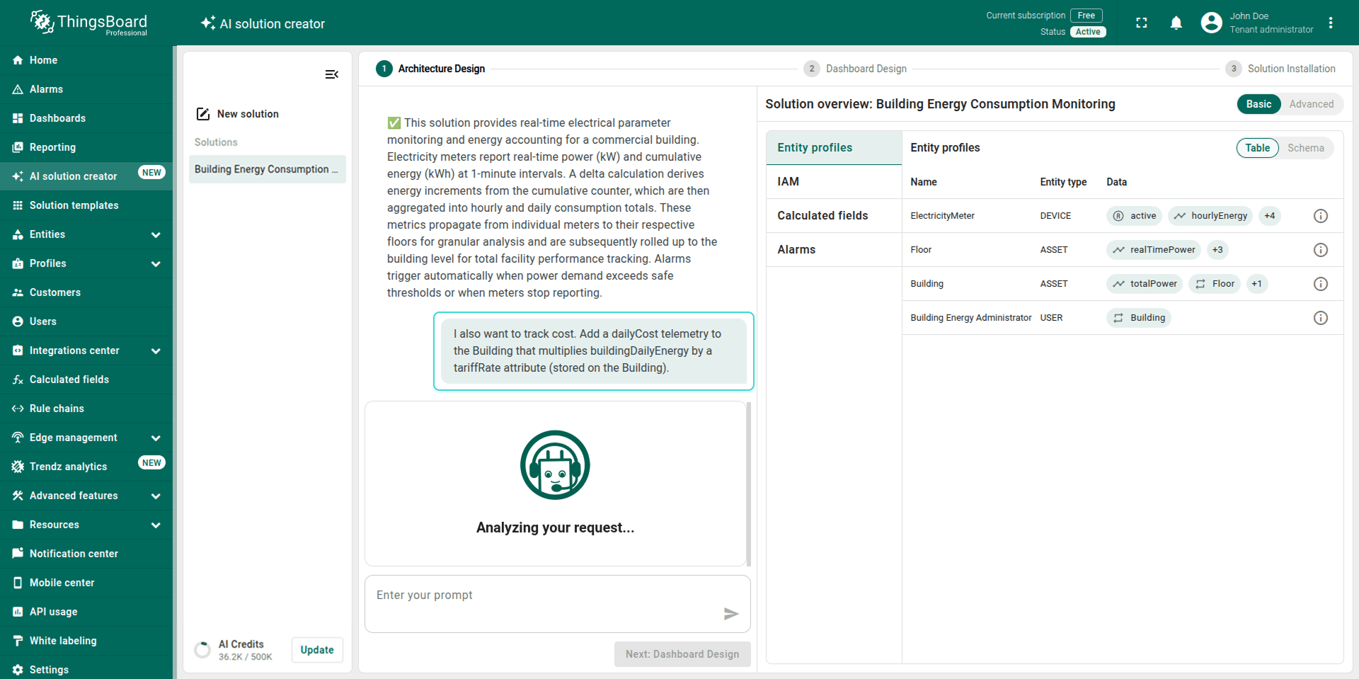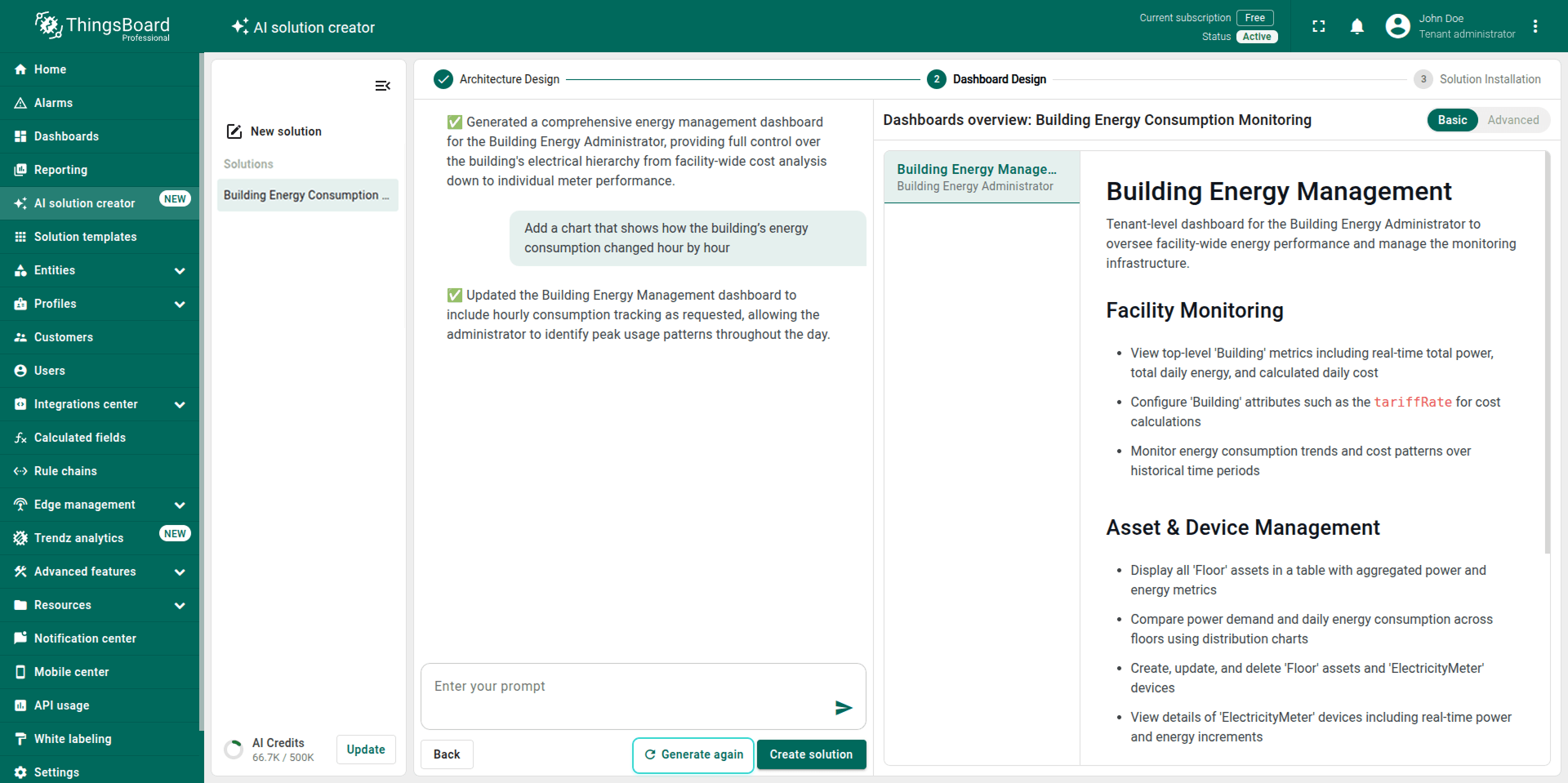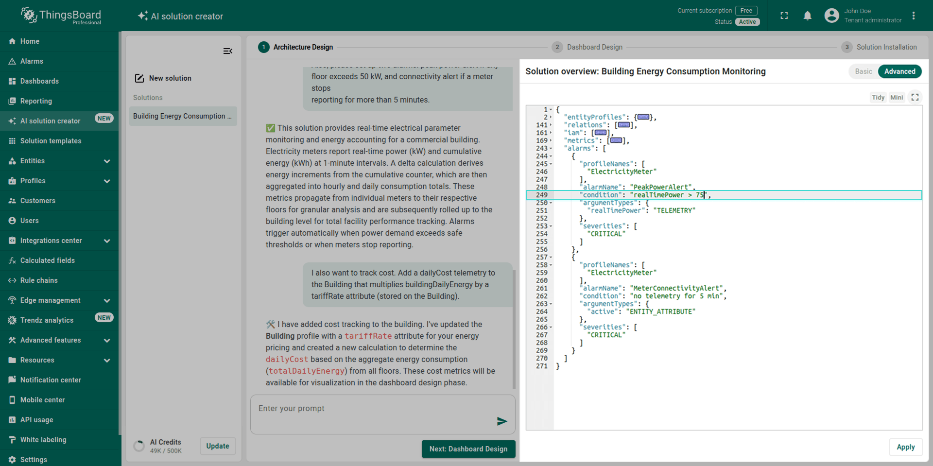Note: The generated solution is a foundational prototype. You can modify any part of it (profiles, dashboards, alarm rules, calculated fields) using the standard ThingsBoard UI.