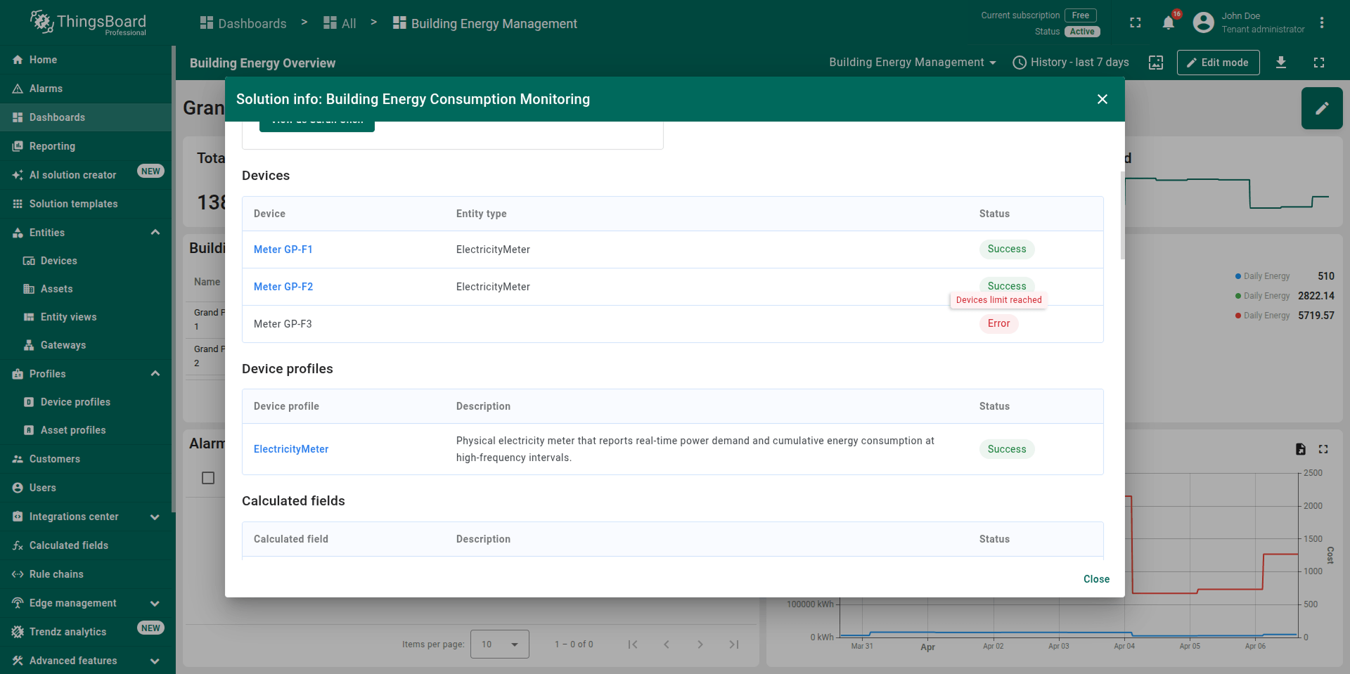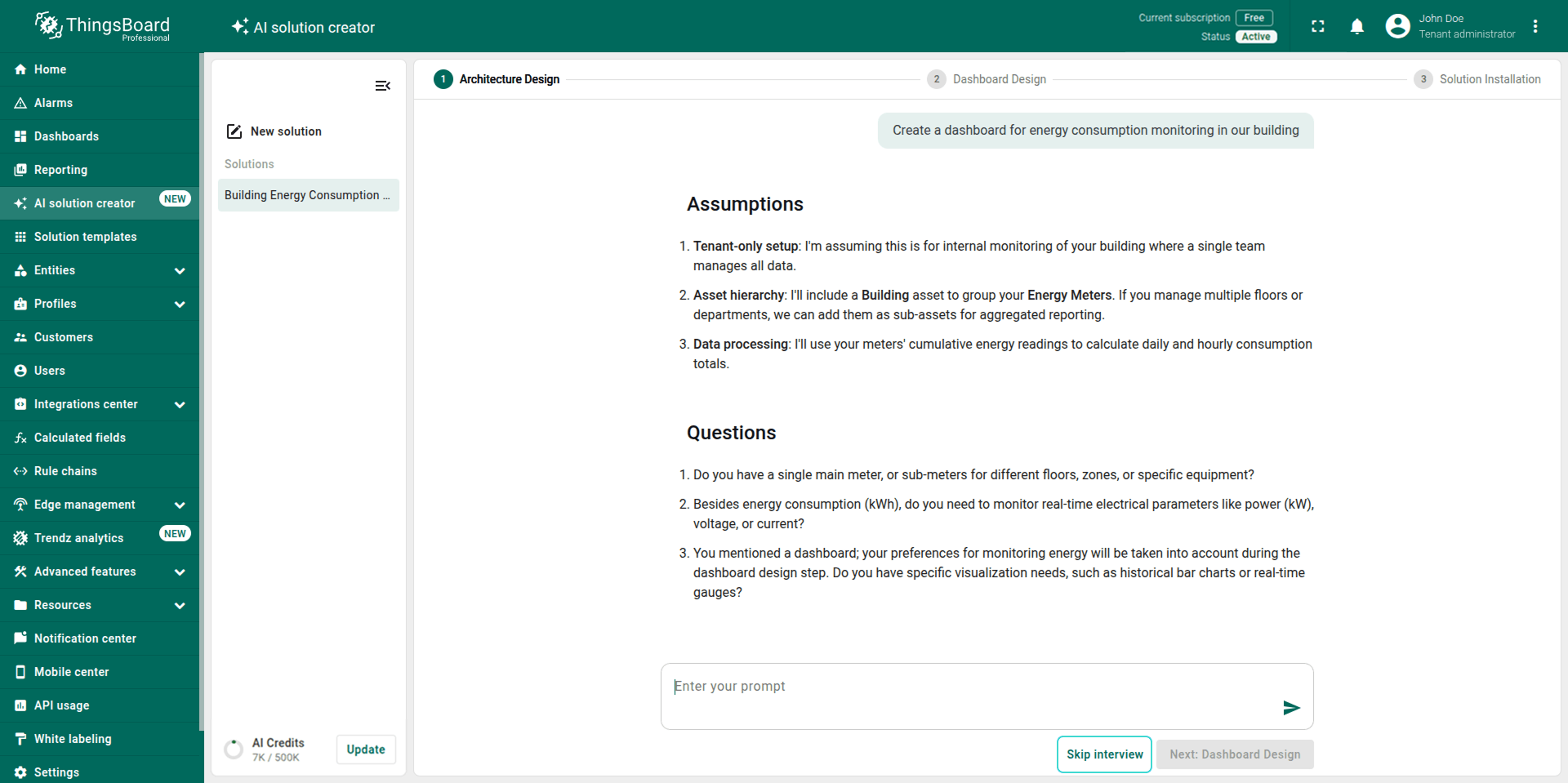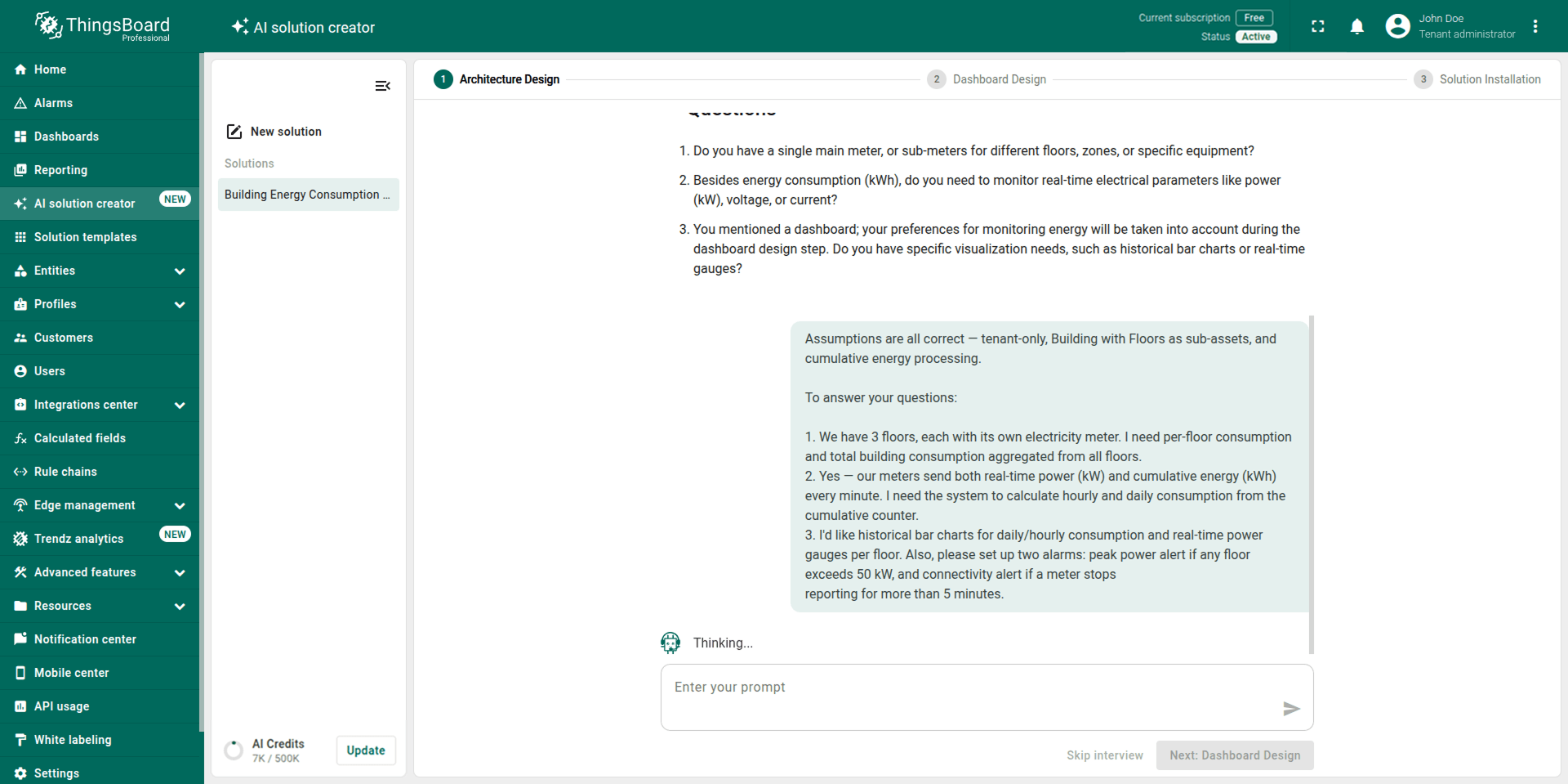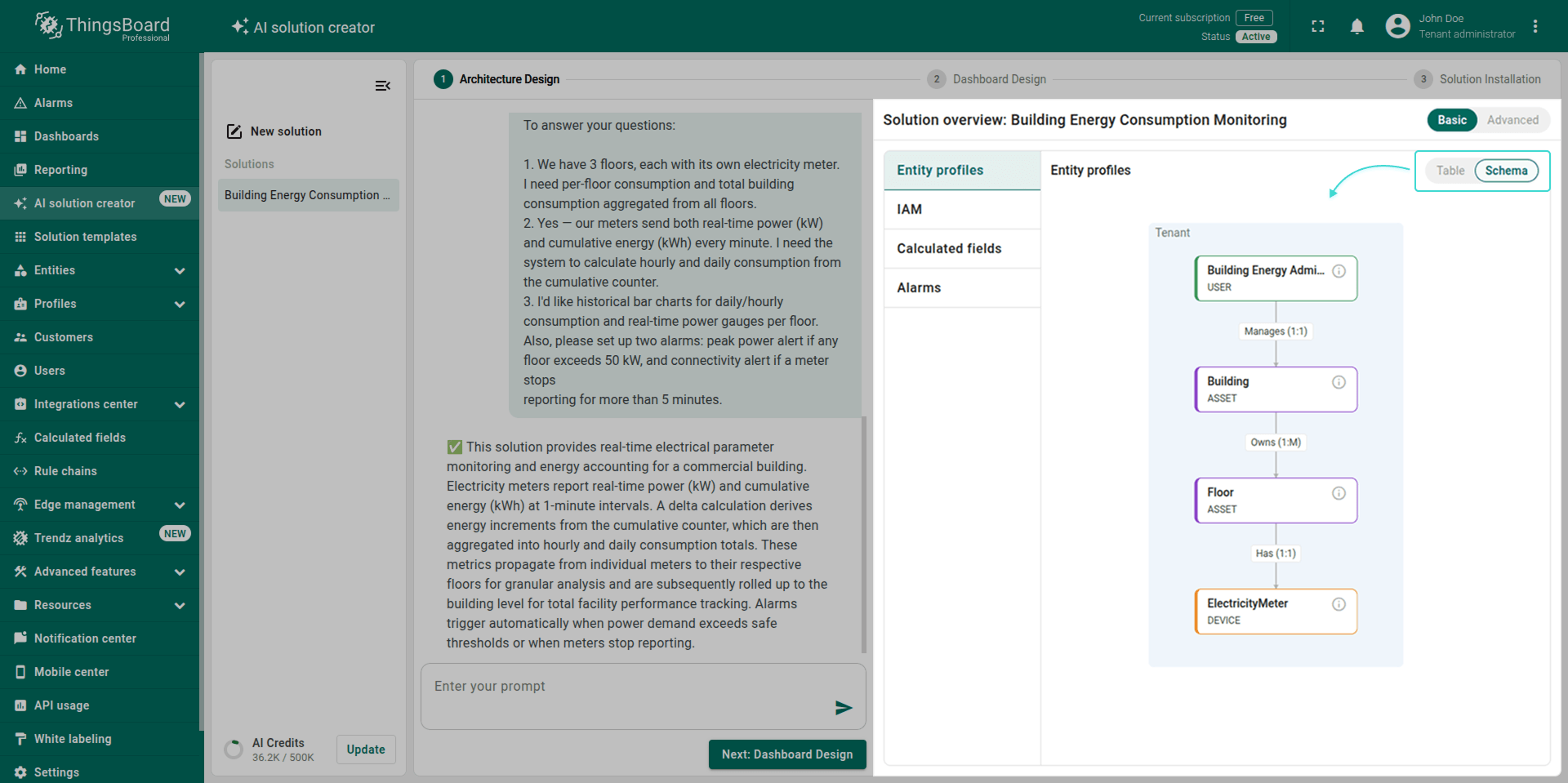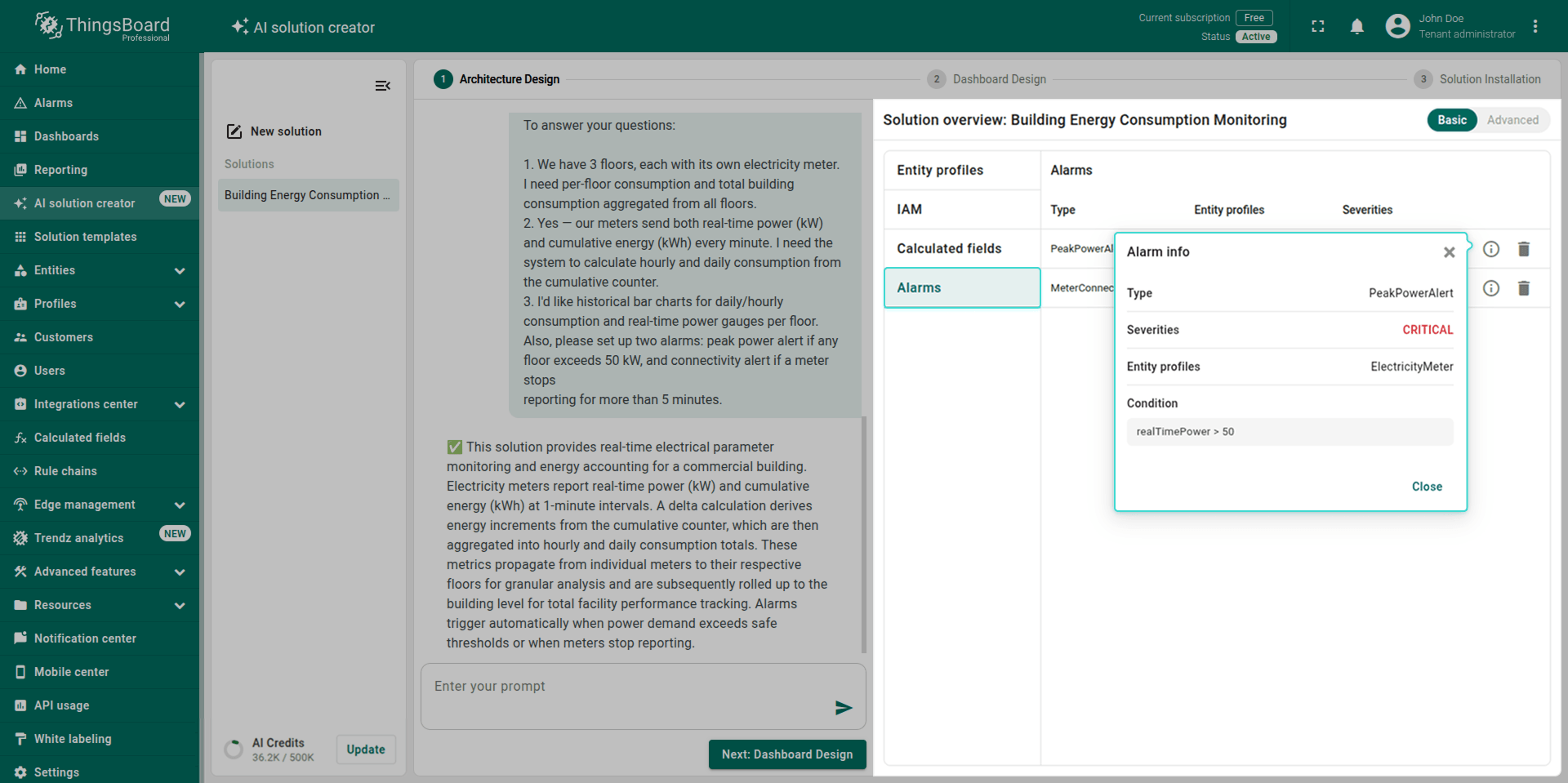 Note: The generated solution is a foundational prototype. You can modify any part of it (profiles, dashboards, alarm rules, calculated fields) using the standard ThingsBoard UI.