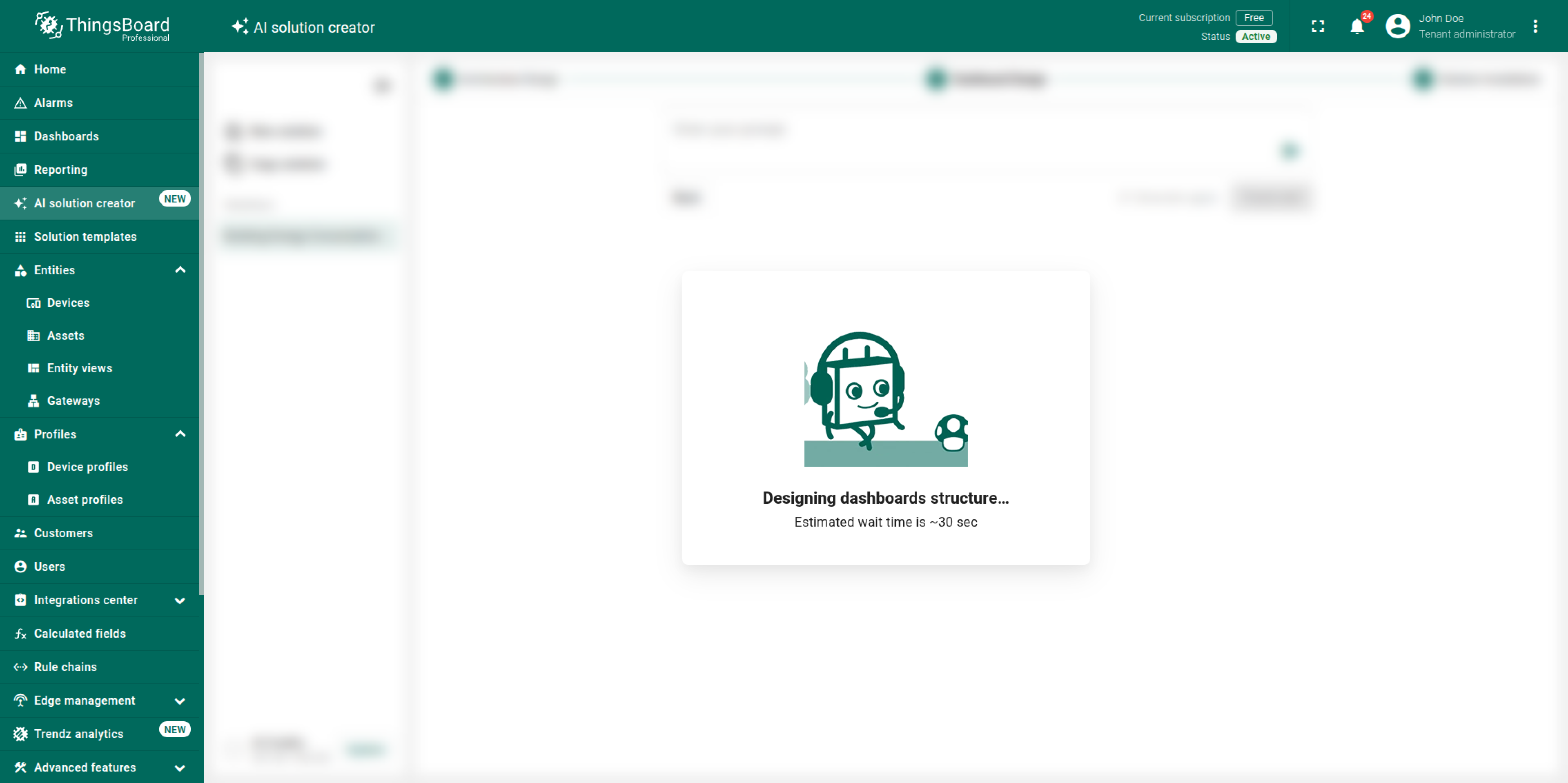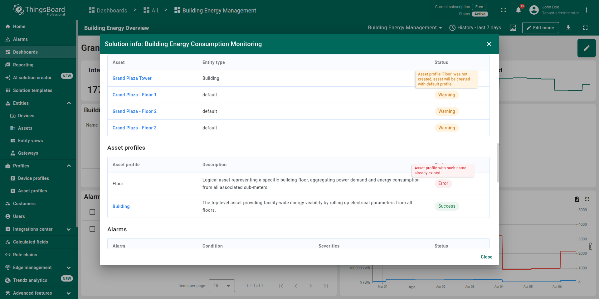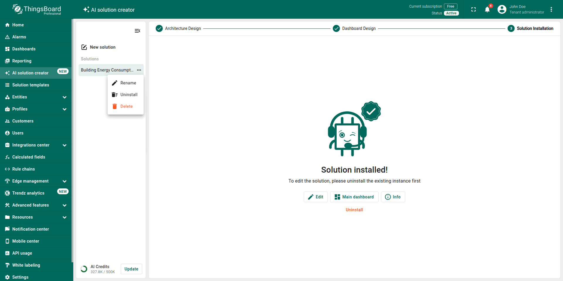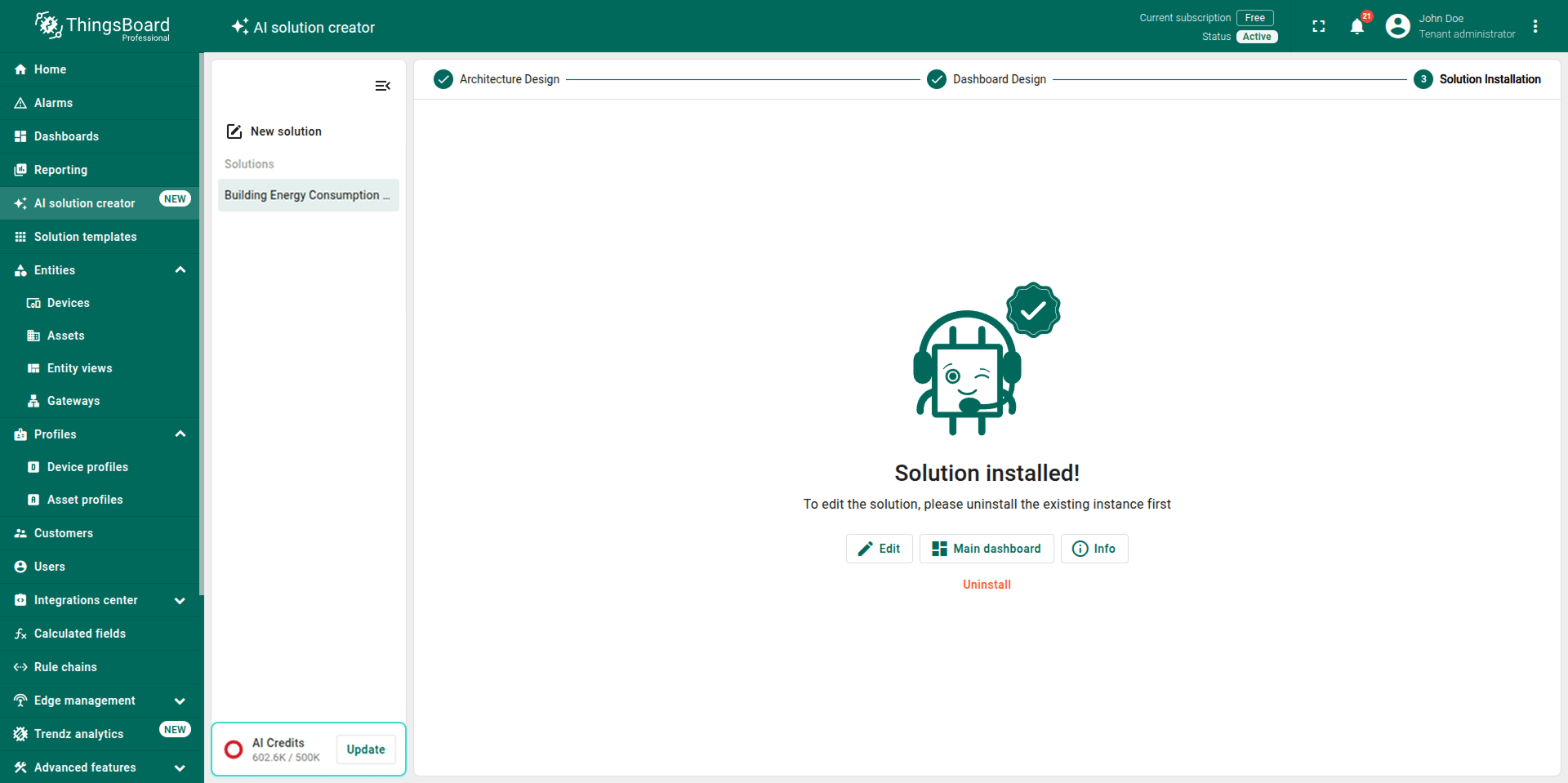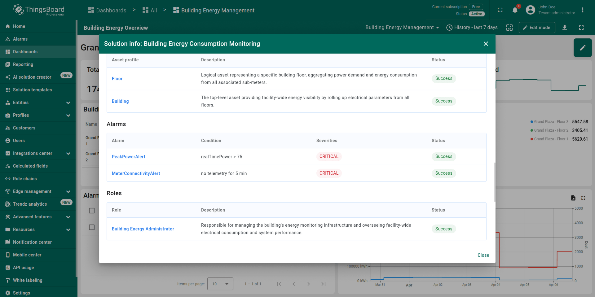 Note: The generated solution is a foundational prototype. You can modify any part of it (profiles, dashboards, alarm rules, calculated fields) using the standard ThingsBoard UI.