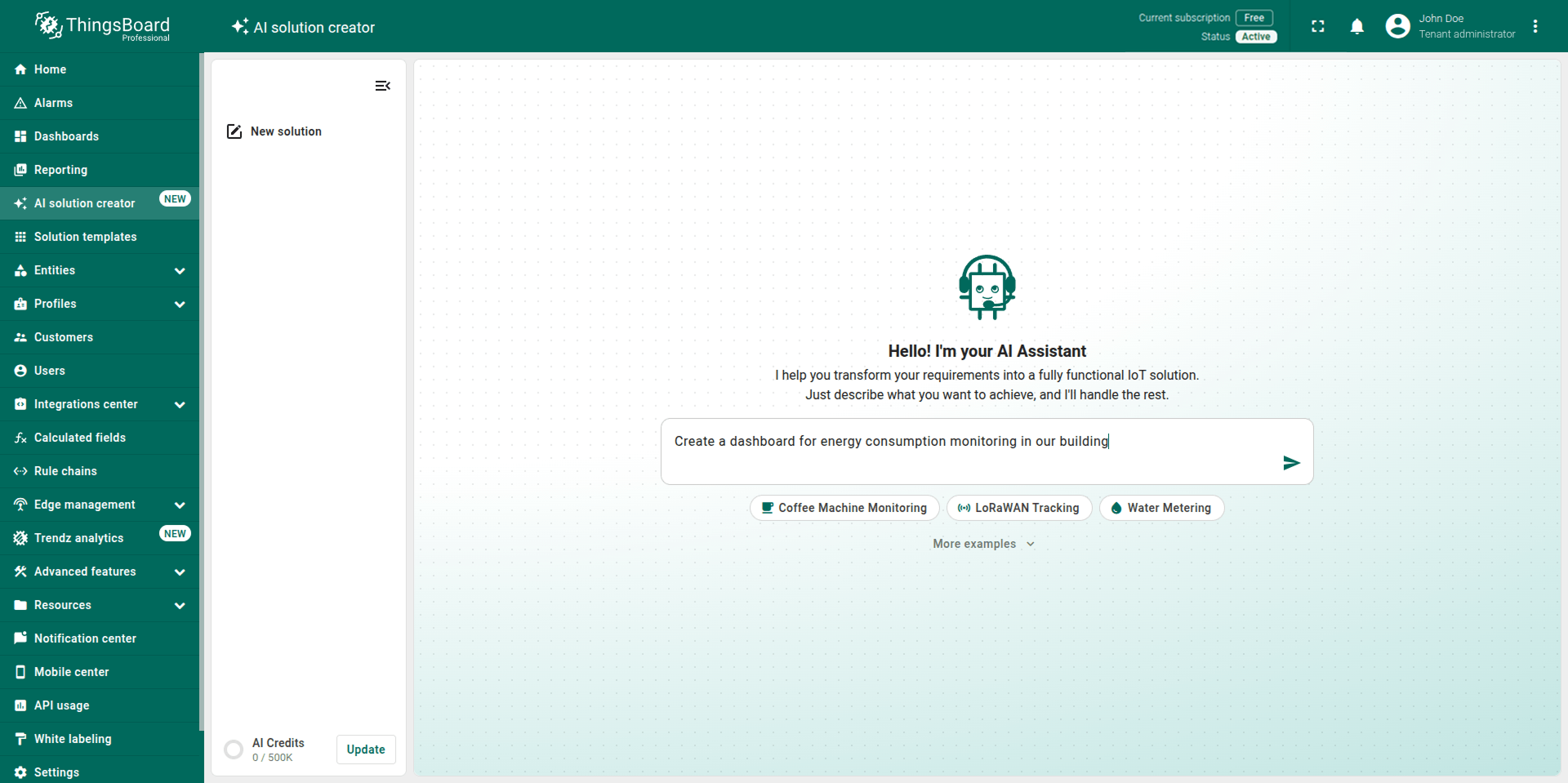 AI Solution Creator is an AI-powered wizard that generates a complete working IoT solution from a natural language description of your use case. No setup guides, no configuration manuals, no prior platform knowledge needed.