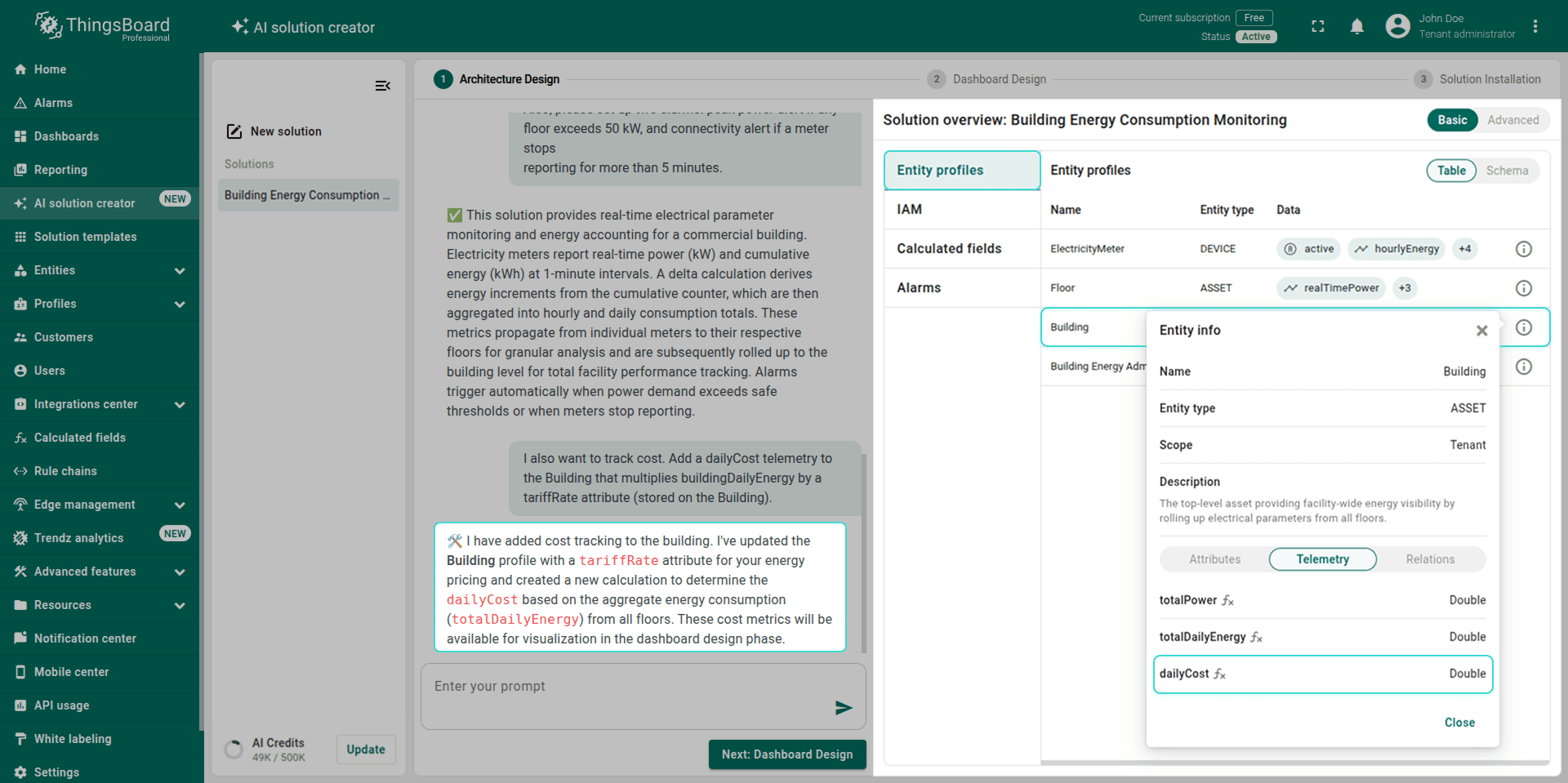 • Via chat: Describe what you’d like to change in natural language. The AI Assistant analyzes your request and applies changes to all necessary places, like entity profiles, IAM, calculated fields, or alarm rules. For example: “I also want to track cost. Add a dailyCost telemetry to the Building that multiplies buildingDailyEnergy by a tariffRate attribute (stored on the Building).”