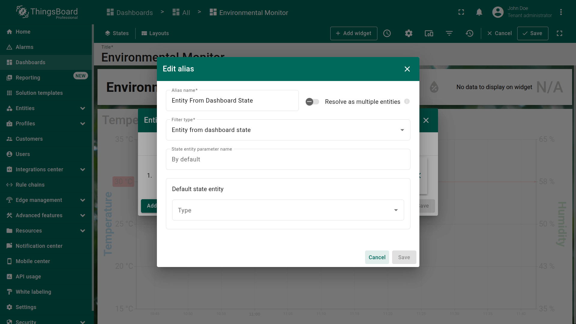 All widgets on this dashboard use the entity alias “Entity from dashboard state” as their data source.