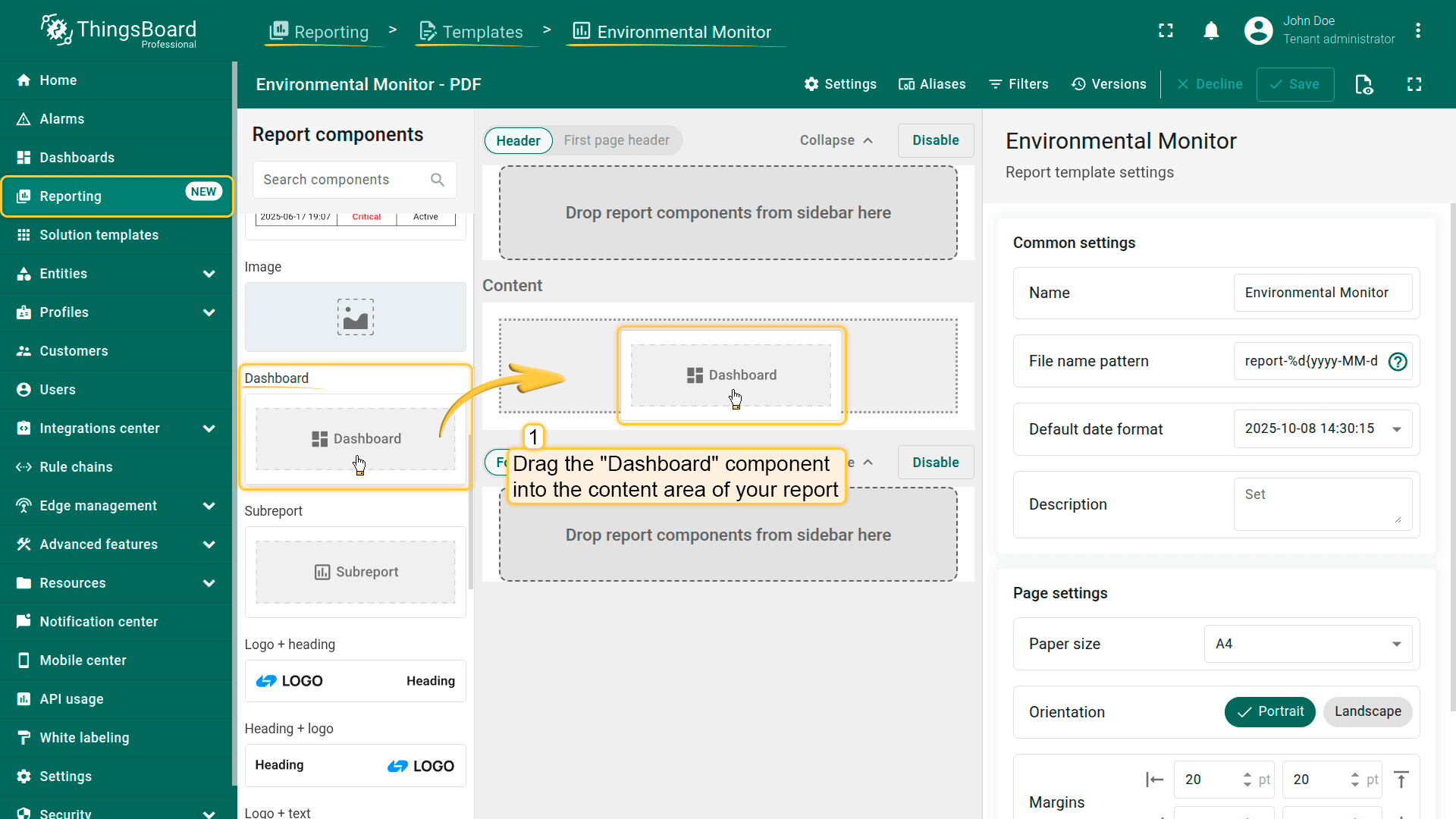 - In the Components library, find the Dashboard component and drag it into the content area of your report.