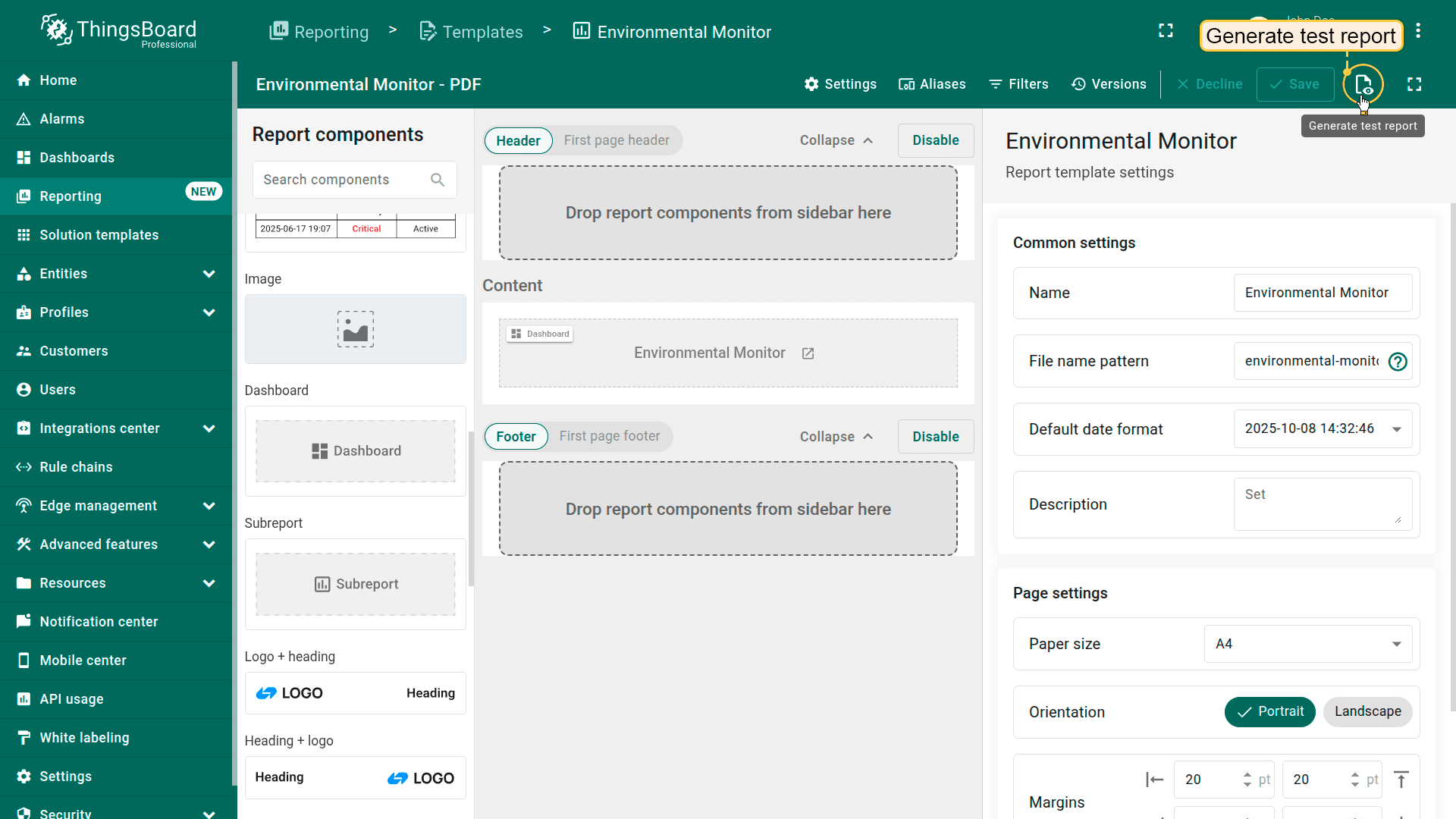 - To verify that your template is set up correctly and the data displays as expected, click Generate test report (next to the Save button). The system will generate a sample report using the available test data from the selected device or entity alias.