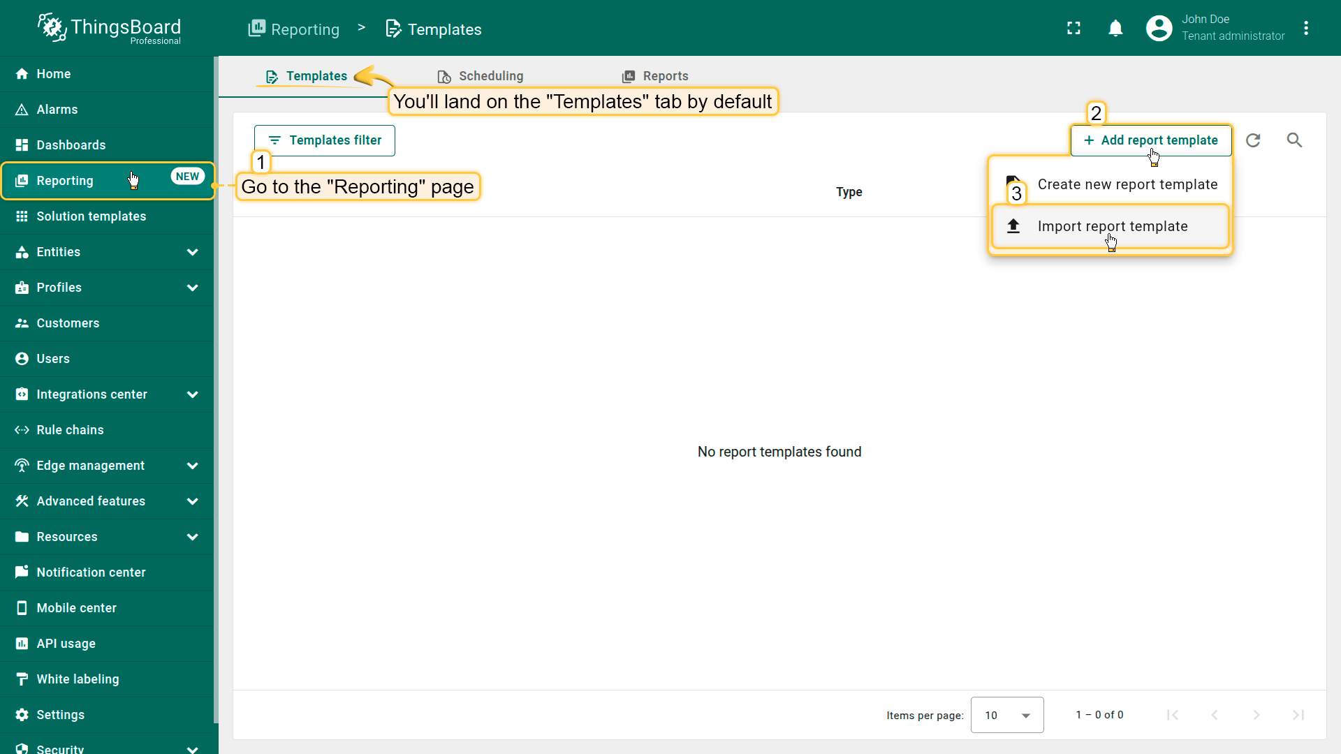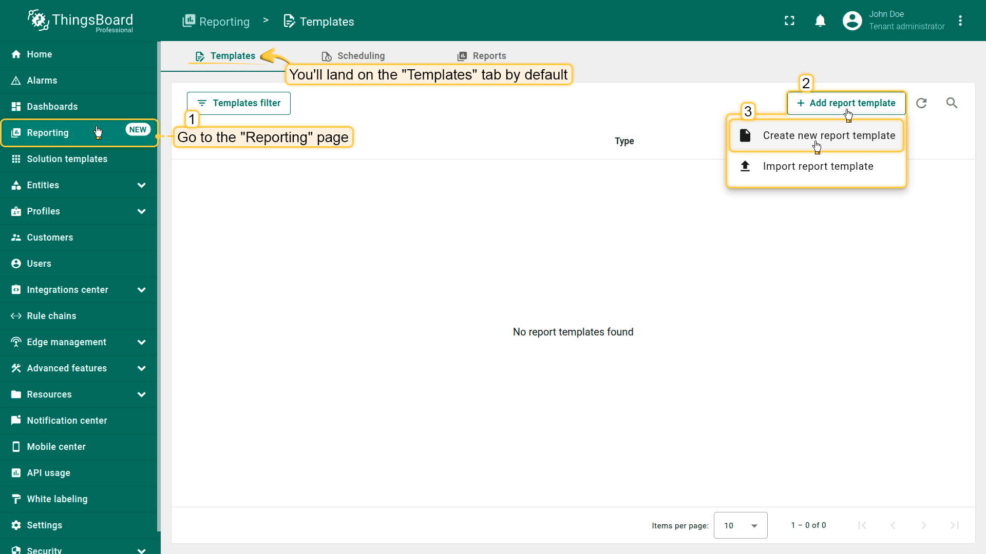 - Open the “Reporting” page from the left-hand sidebar. You'll automatically be taken to the “Templates” tab.
