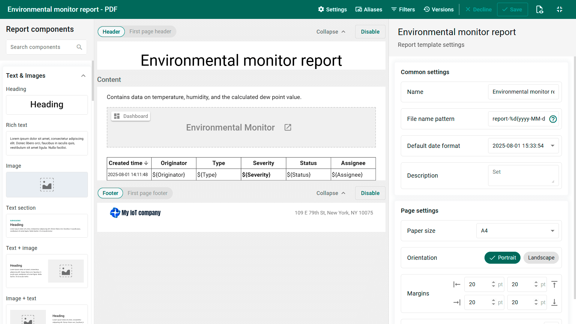 In ThingsBoard, report components provide data as variables that can be directly referenced inside component elements. You can insert these variables anywhere text is allowed — for example, in a text block, table header, chart label, or other dynamic fields. This enables you to create highly personalized, context-aware reports.