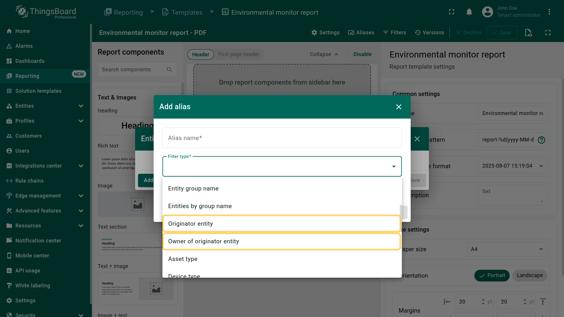 Report templates fully support the same entity alias model as dashboards in ThingsBoard. Additionally, several new entity filters have been introduced: