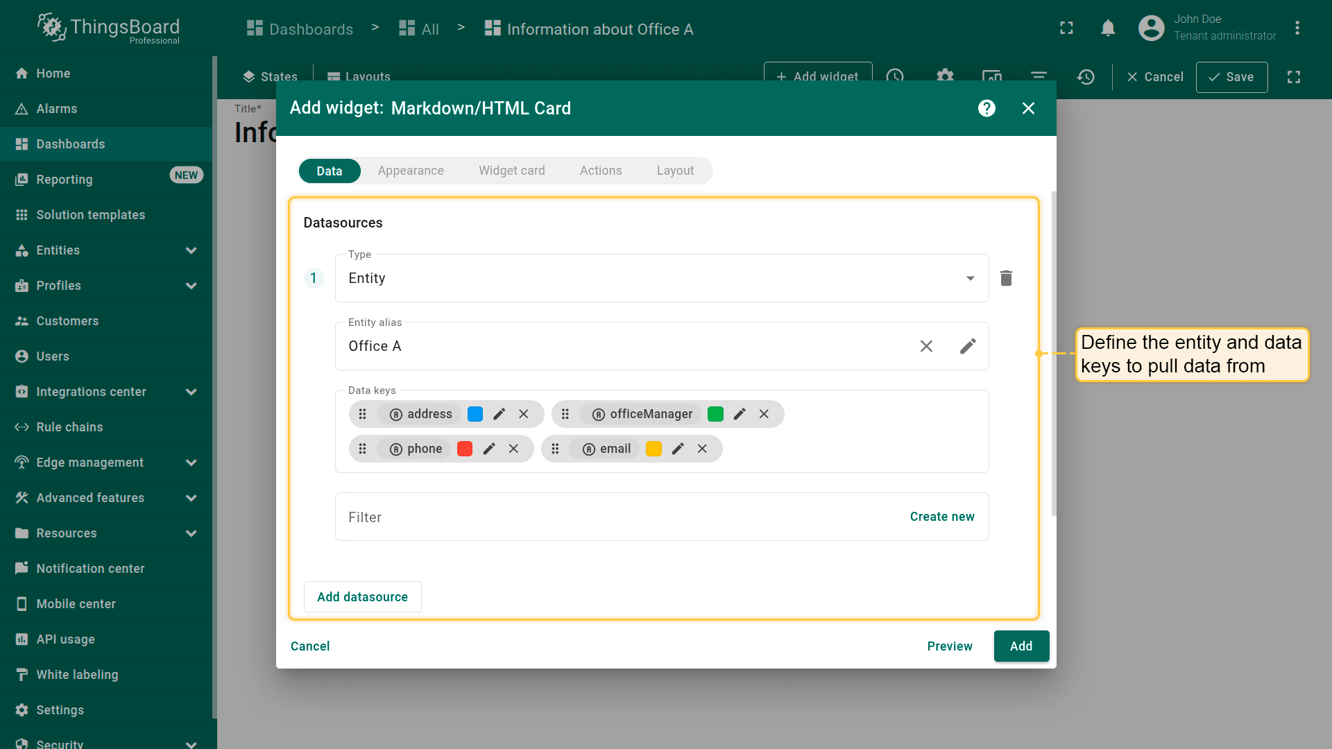 - Optional data. Pull telemetry/attributes via entity alias and data keys to inject values in a template or process them in a value function.