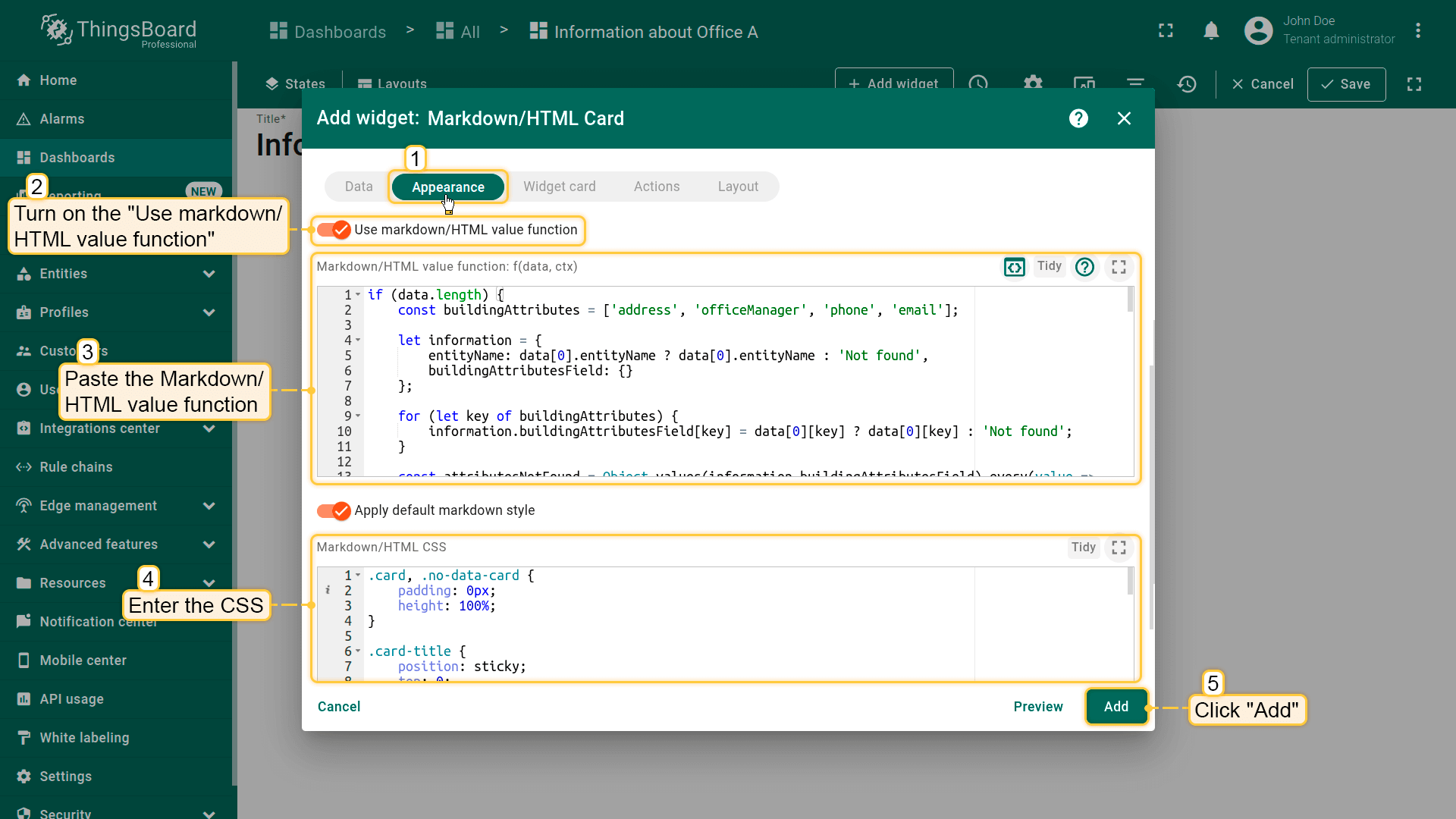 - Open or create a dashboard, then add the Markdown/HTML Card widget.