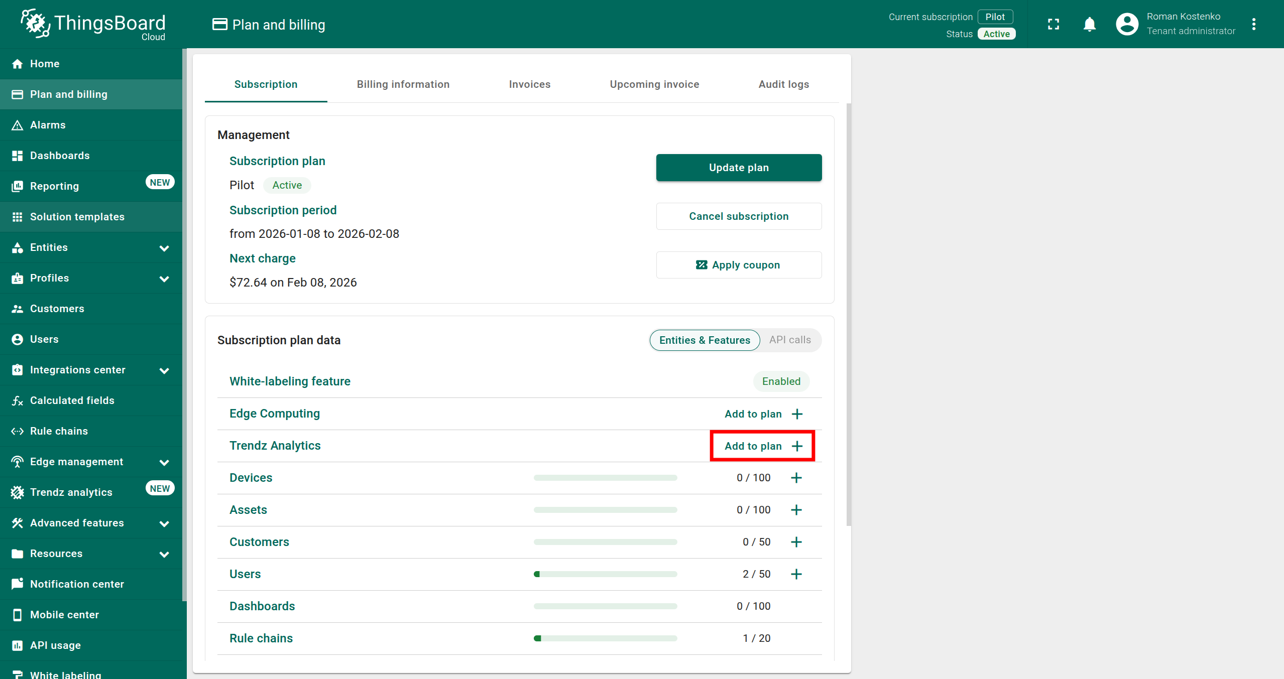 This guide describes how to activate Trendz in your ThingsBoard public Cloud environment via the Billing page.