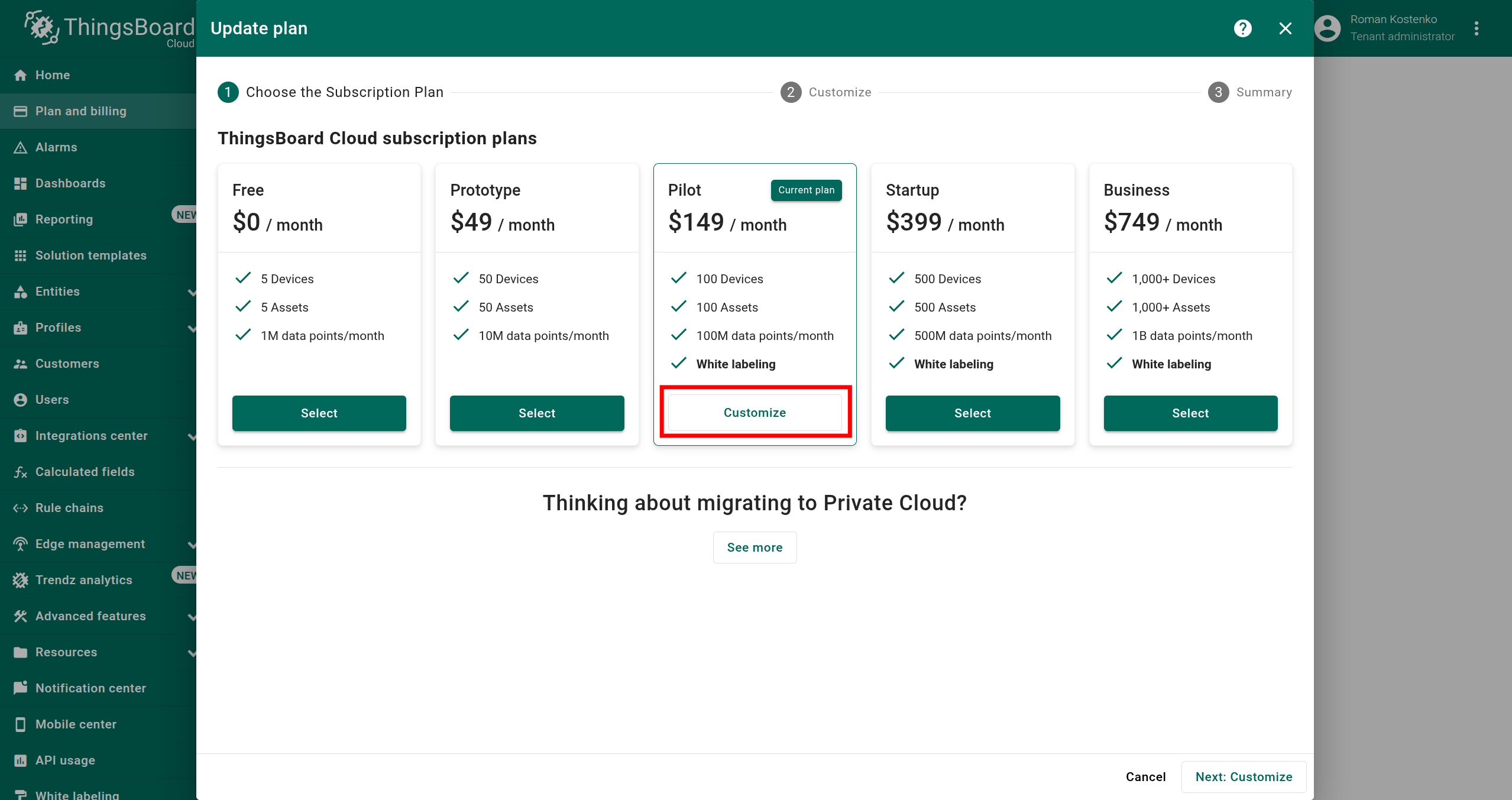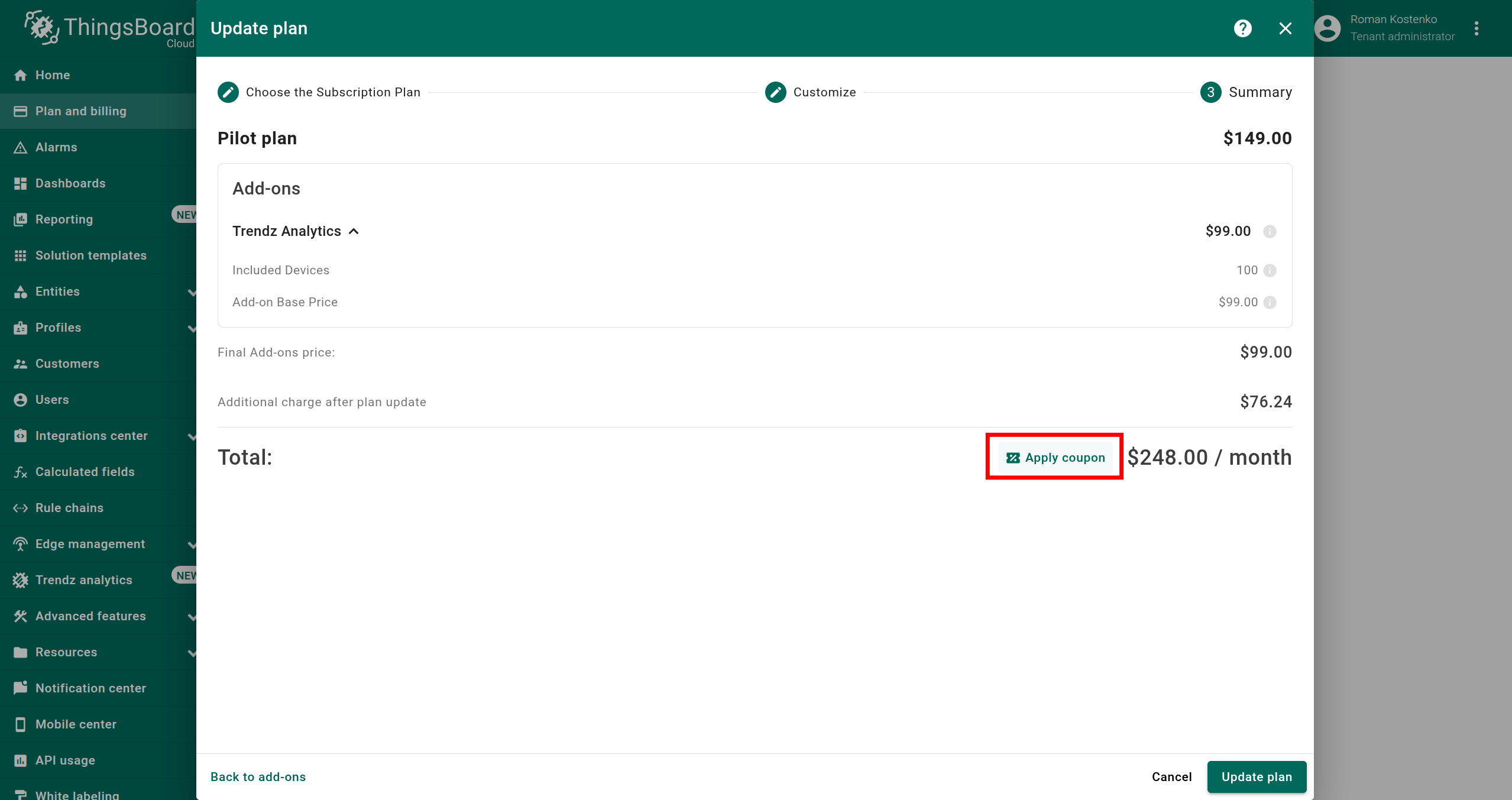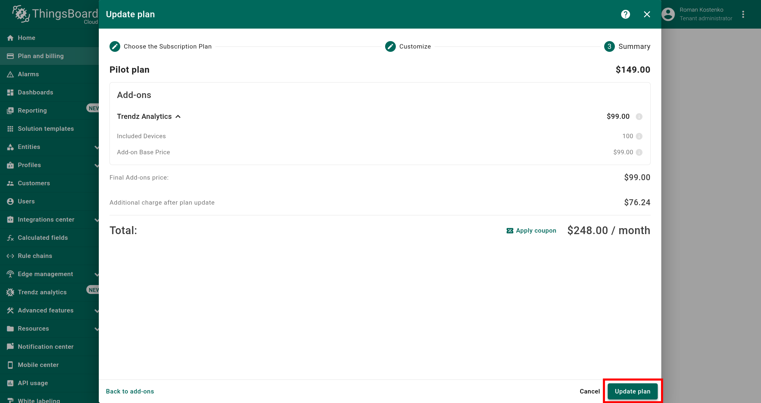 You can find out up-to-date prices on Trendz add-on in the ThingsBoard billing page as it is shown on step-3.